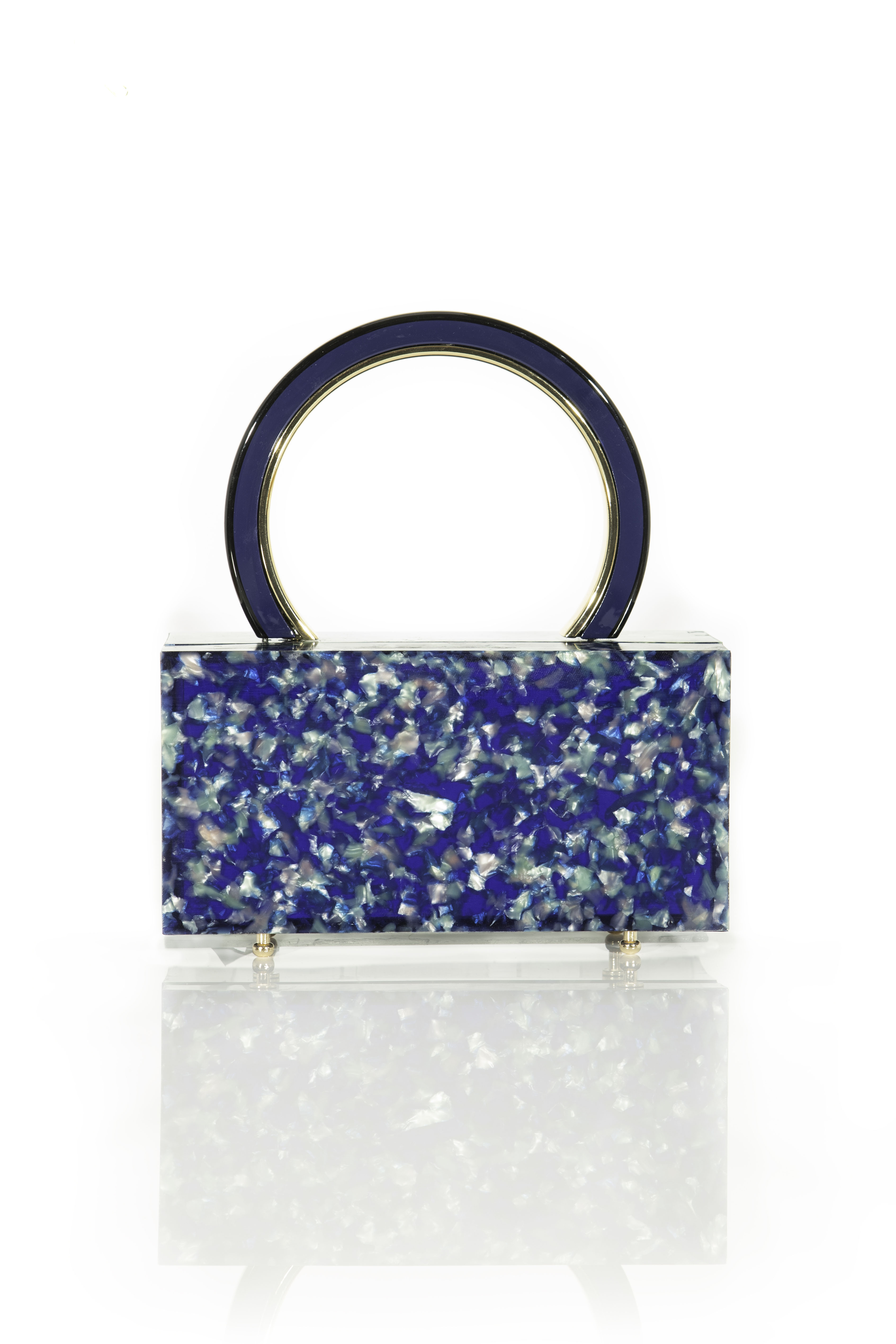 Main material : Cellulose Acetate (eco-friendly) Metal handle Gold colored metal hardware Shape: Rectangle Size: 20cm*10cm*7.5cm Color: Blue and pink