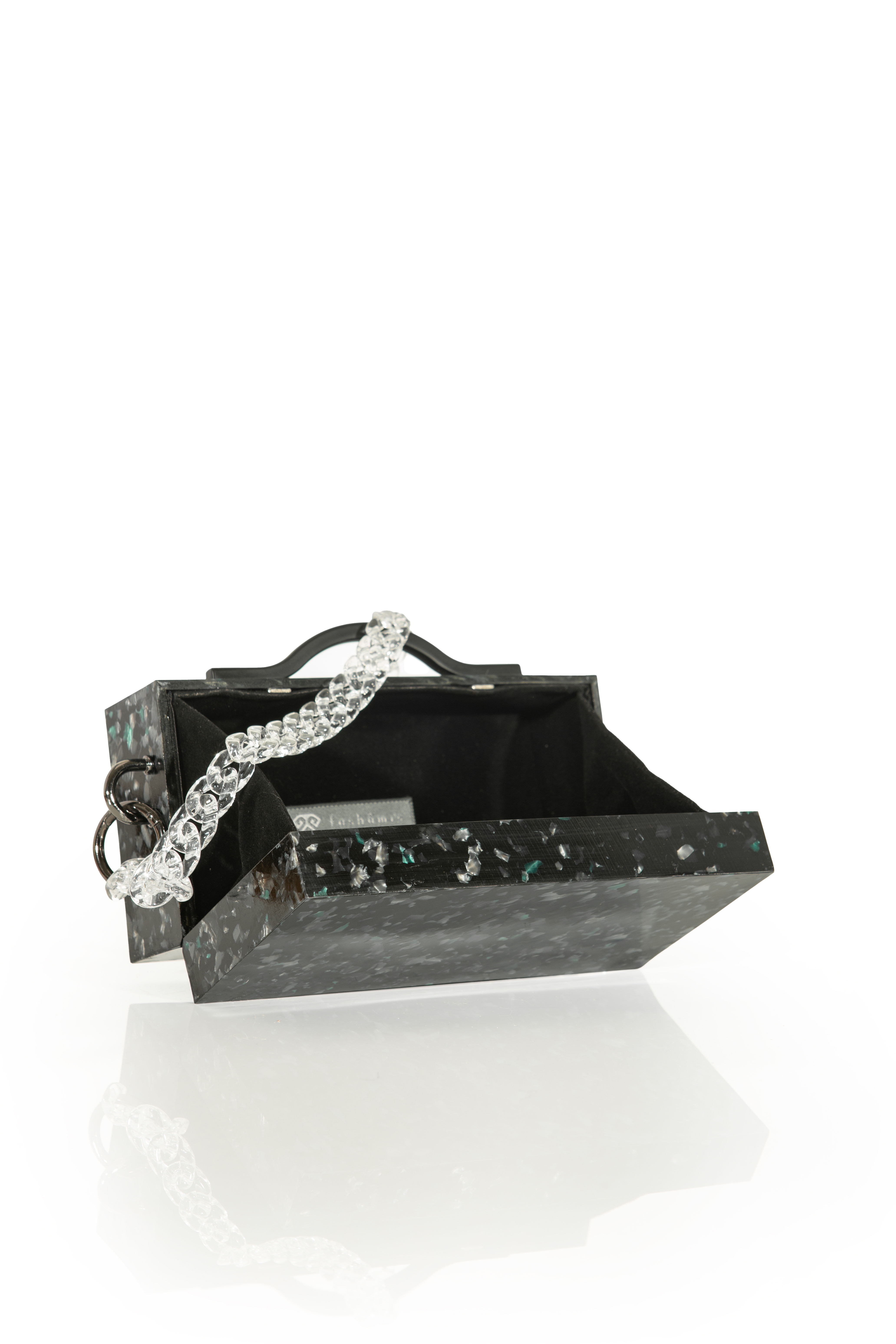 Main material : Cellulose Acetate (eco-friendly) Acrylic strap Metal handle Metalic hardware Shape: Rectangle Size: 20cm*10cm*7.5cm Color: Black with green dots