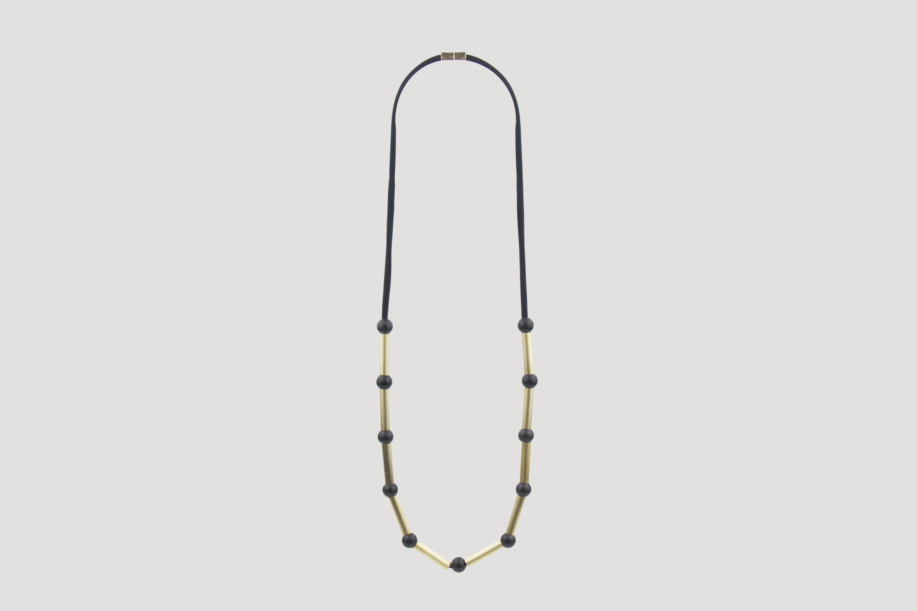 Specifics: - Handmade necklace - Gold plated brass cylinder - Shiny resin spheres - Synthetic rope - Brass clasp - Length: circa 36cm - Width: circa 10cm - Weight: circa 35gr