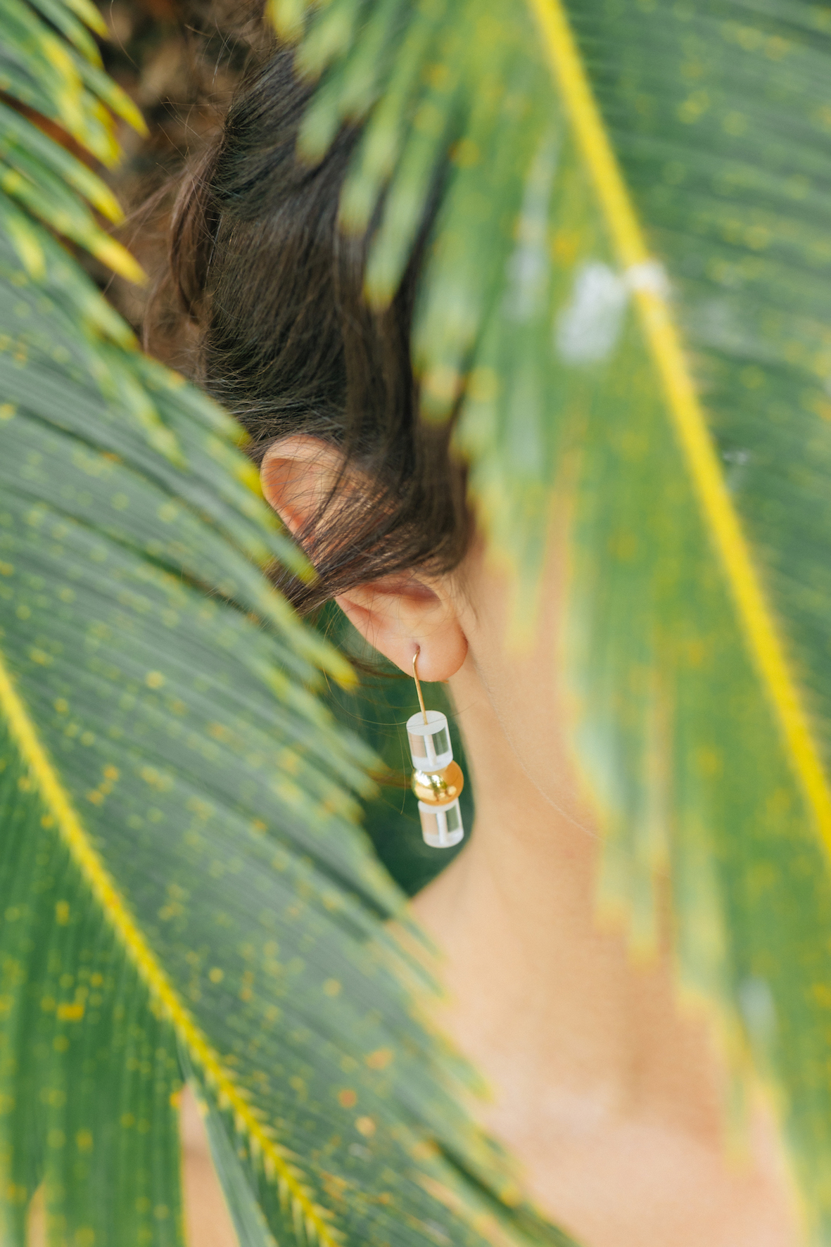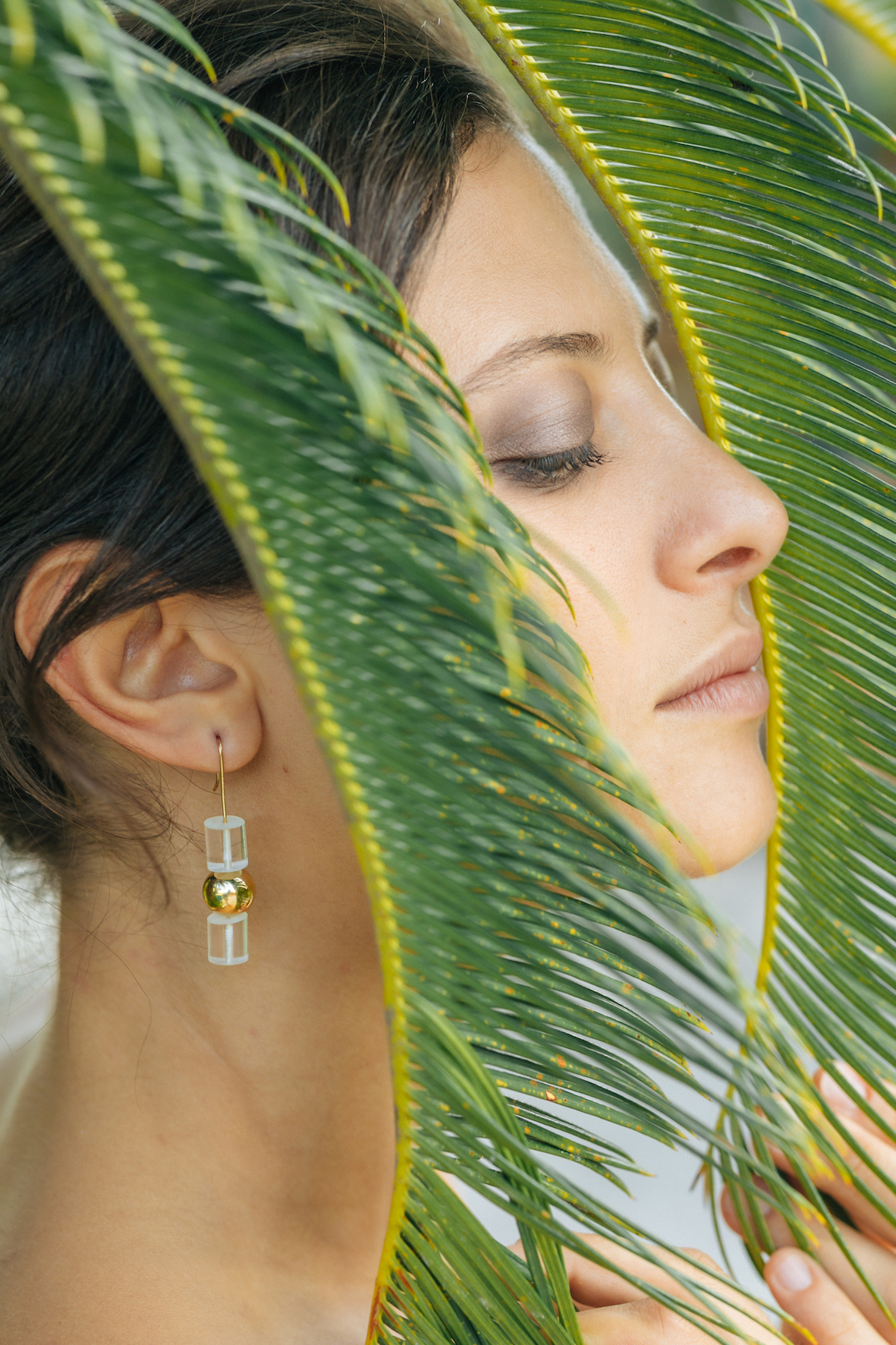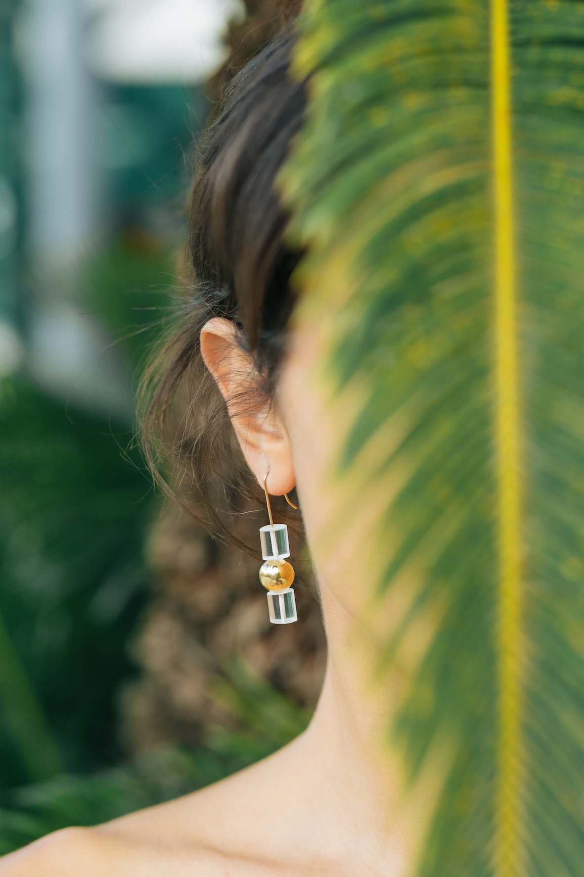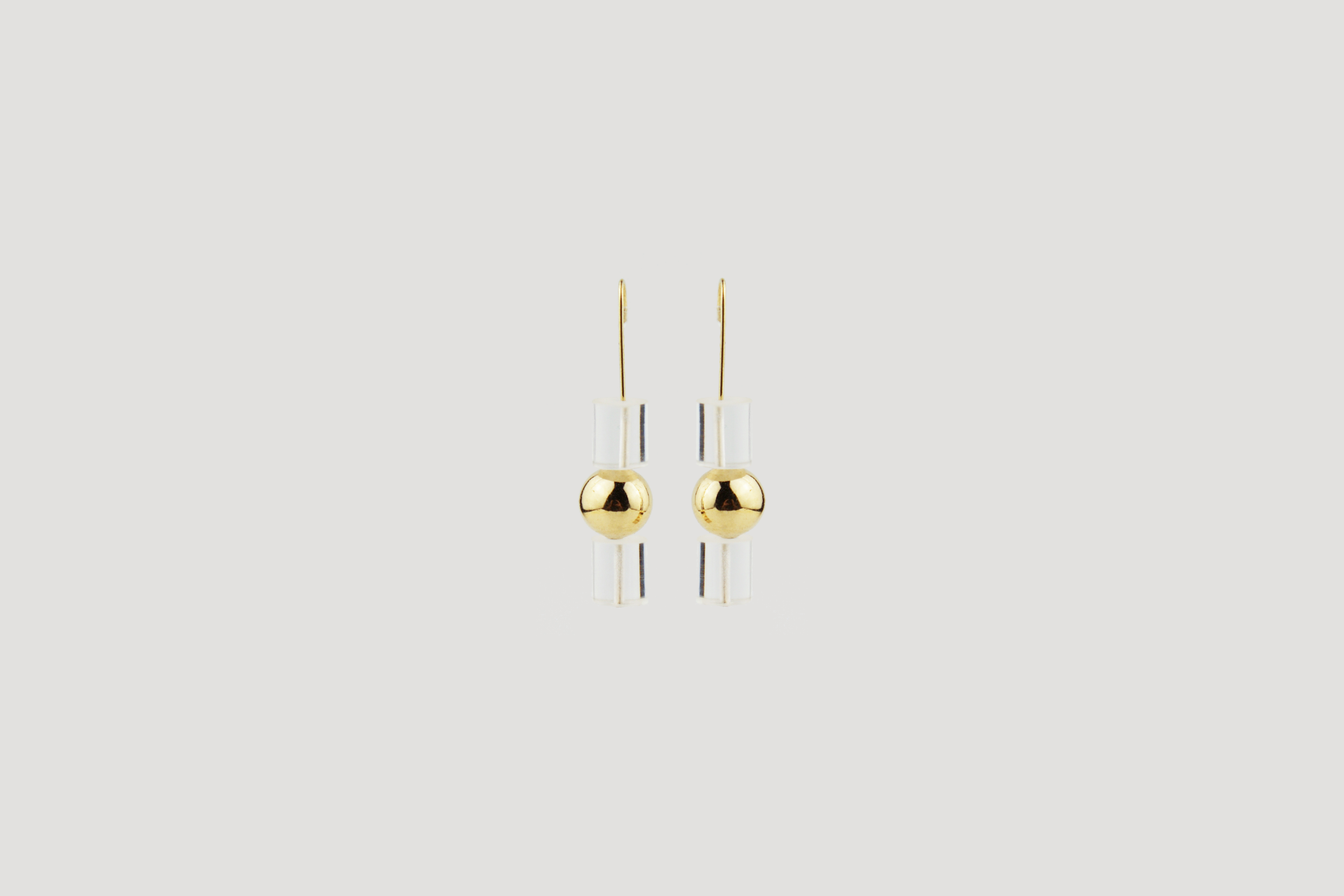 Specifics: Handmade earrings Gold plated spheres Transparent resin Brass pin Nickel free Length: circa 5cm Width: circa 1cm Weight: circa 7gr