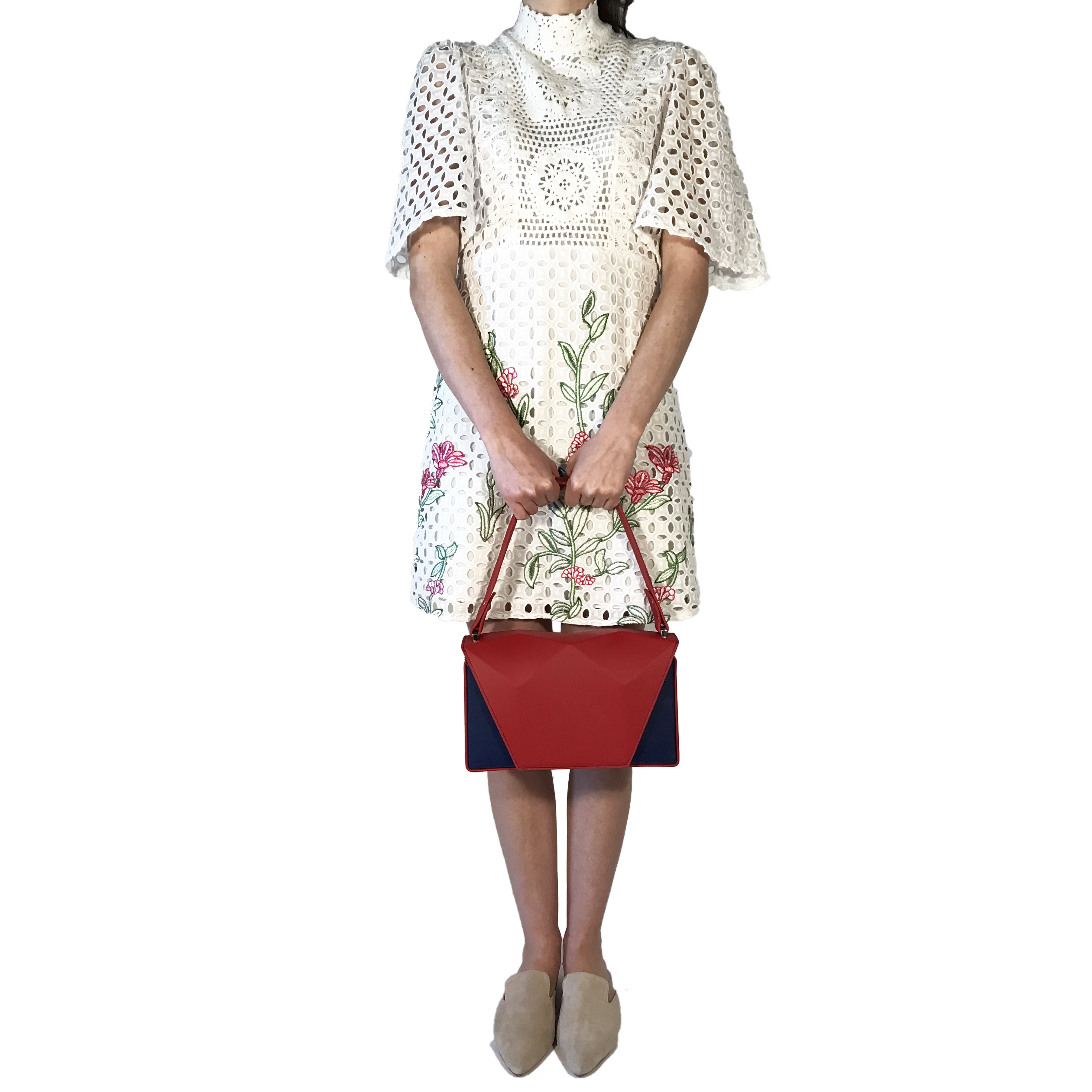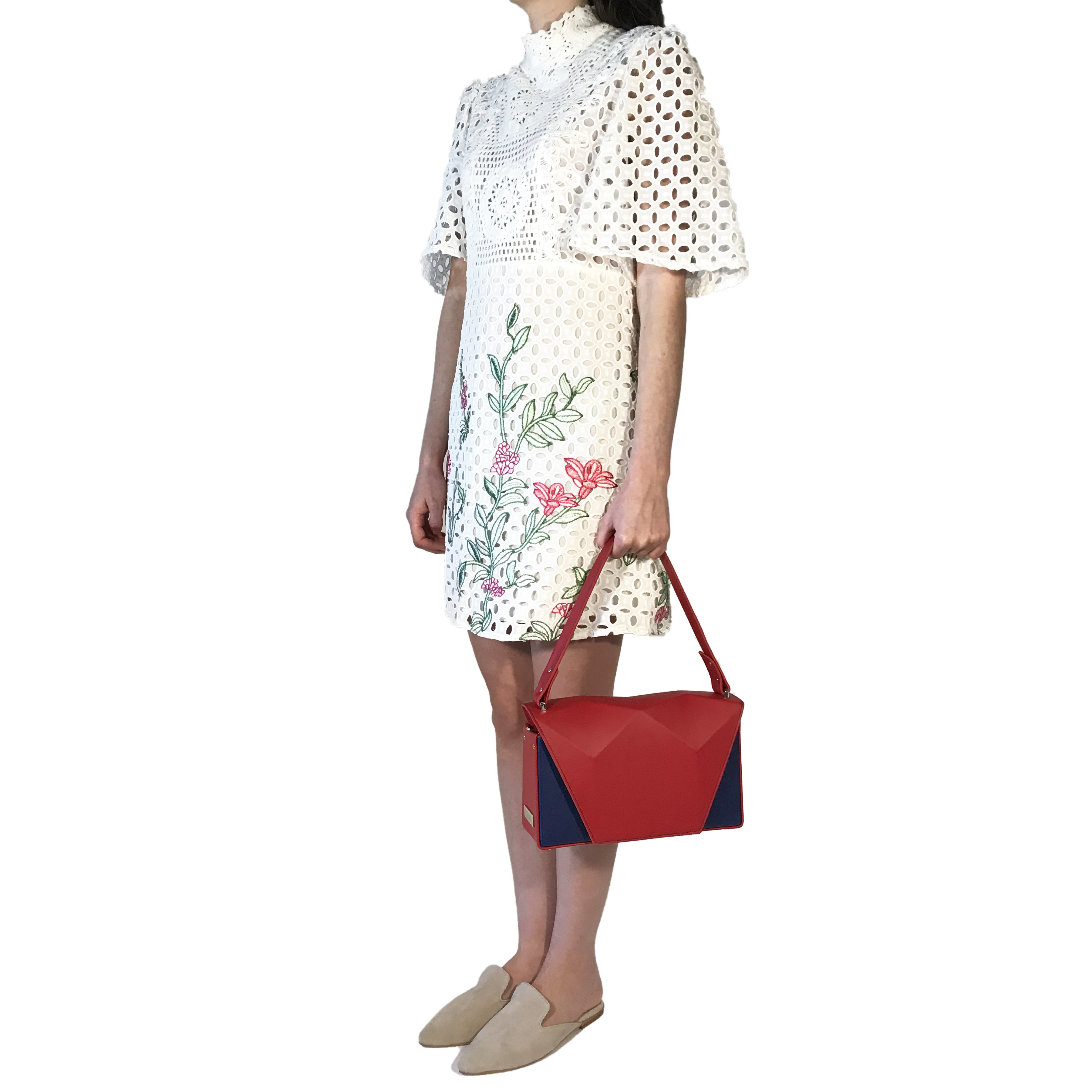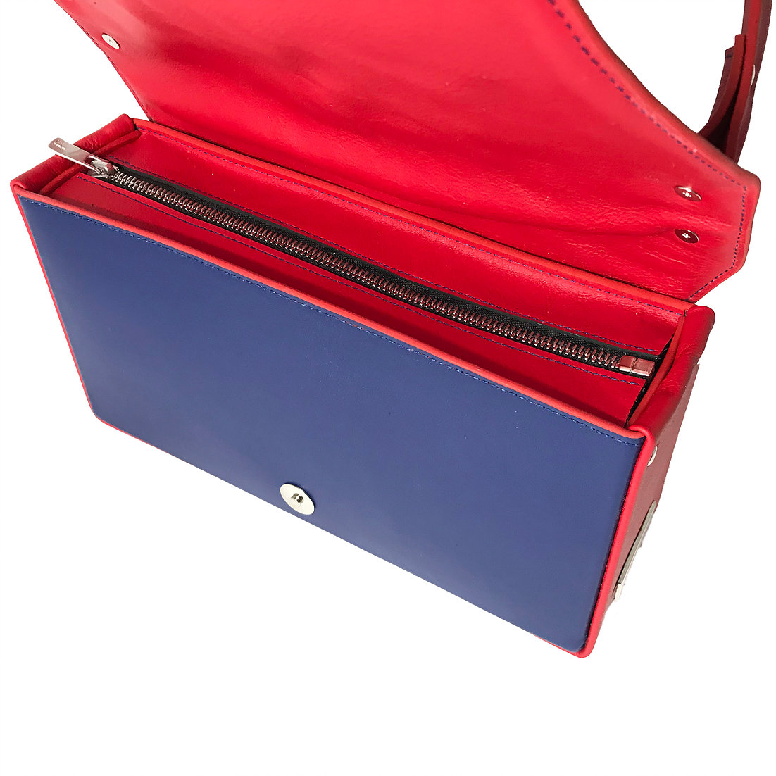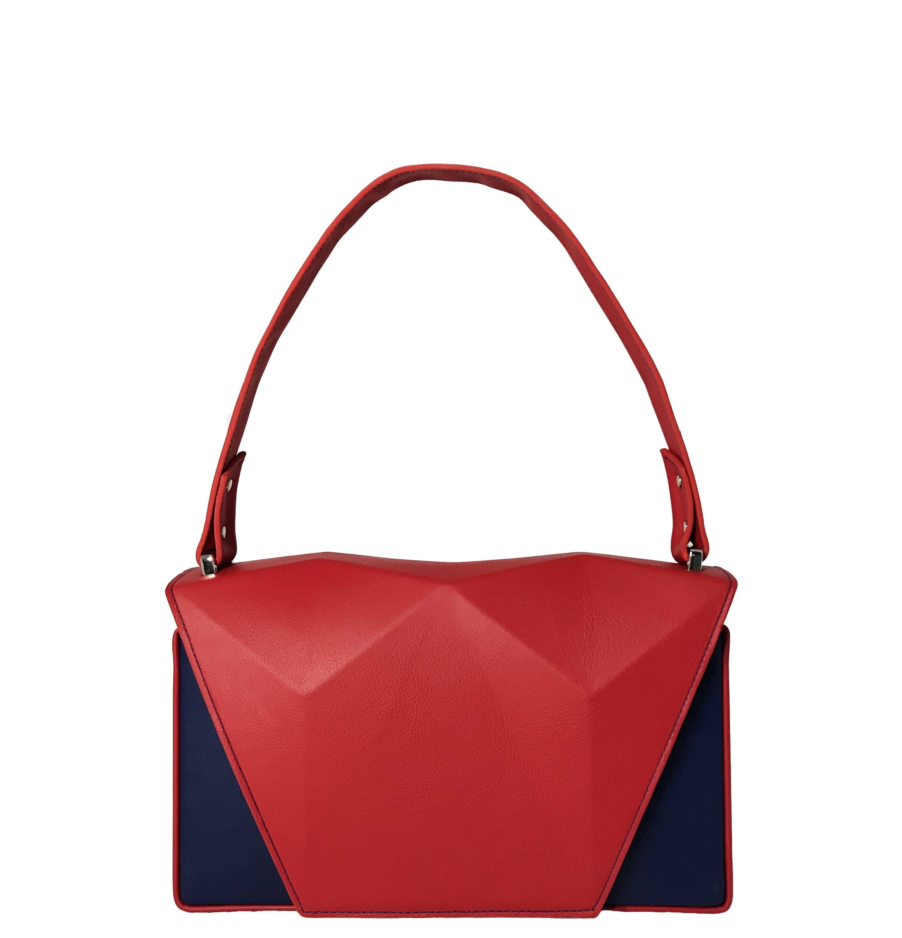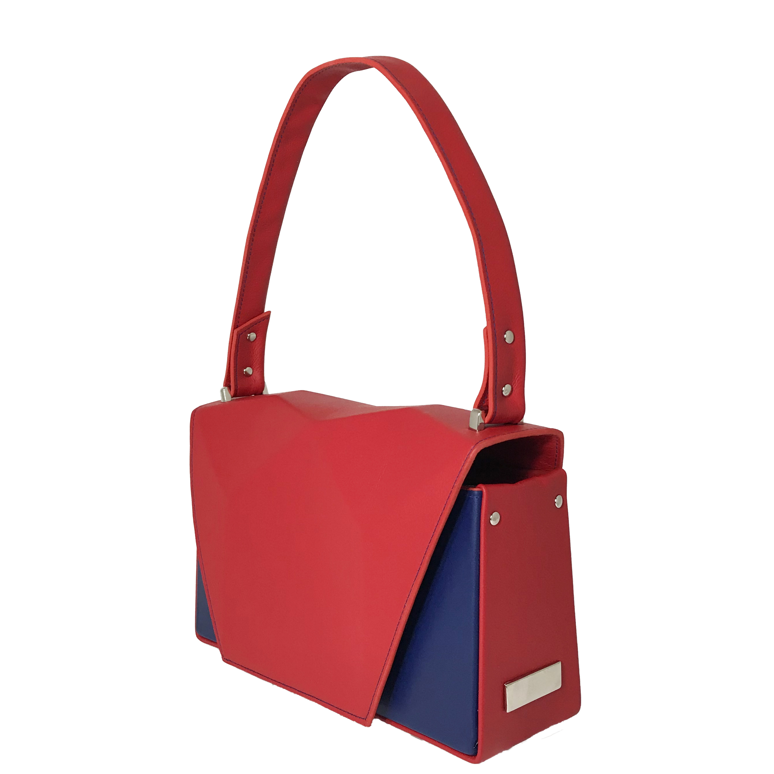 aro hand bag in red/blue leather with nikel details and nikel zipper Inspired by Japanese origami, combined with contemporary, minimal design and created from the finest materials, the aro bag will uniquely complete your minimal outfit product details bag Length : 27.5cm Height : 16.5cm Depth : 9.5cm model Height : 1,67 m