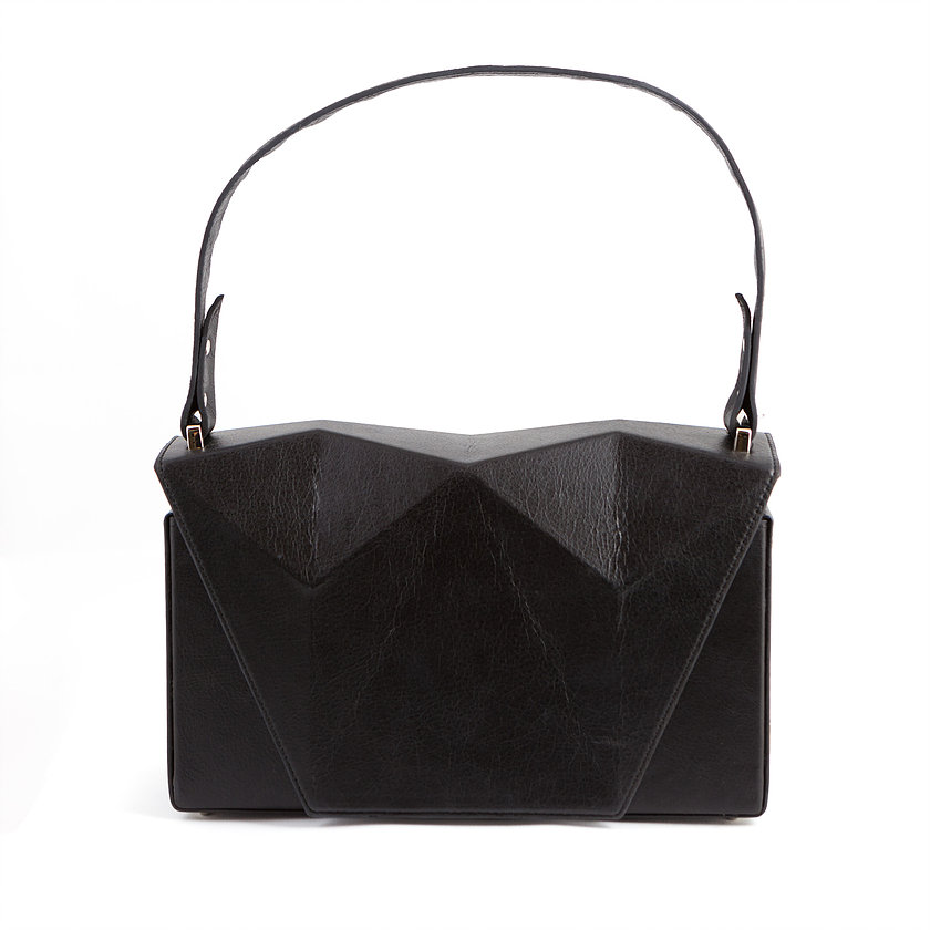 aro hand bag in vintage black leather with nikel details and nikel zipper Inspired by Japanese origami, combined with contemporary, minimal design and created from the finest materials, the aro bag will uniquely complete your minimal outfit product details bag Length : 27.5cm Height : 16.5cm Depth : 9.5cm model Height : 1,67 m