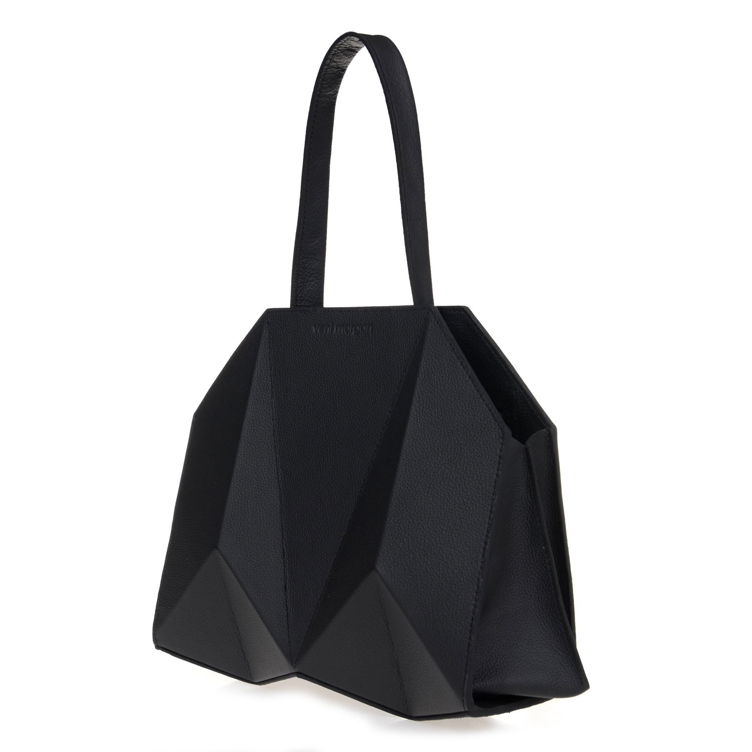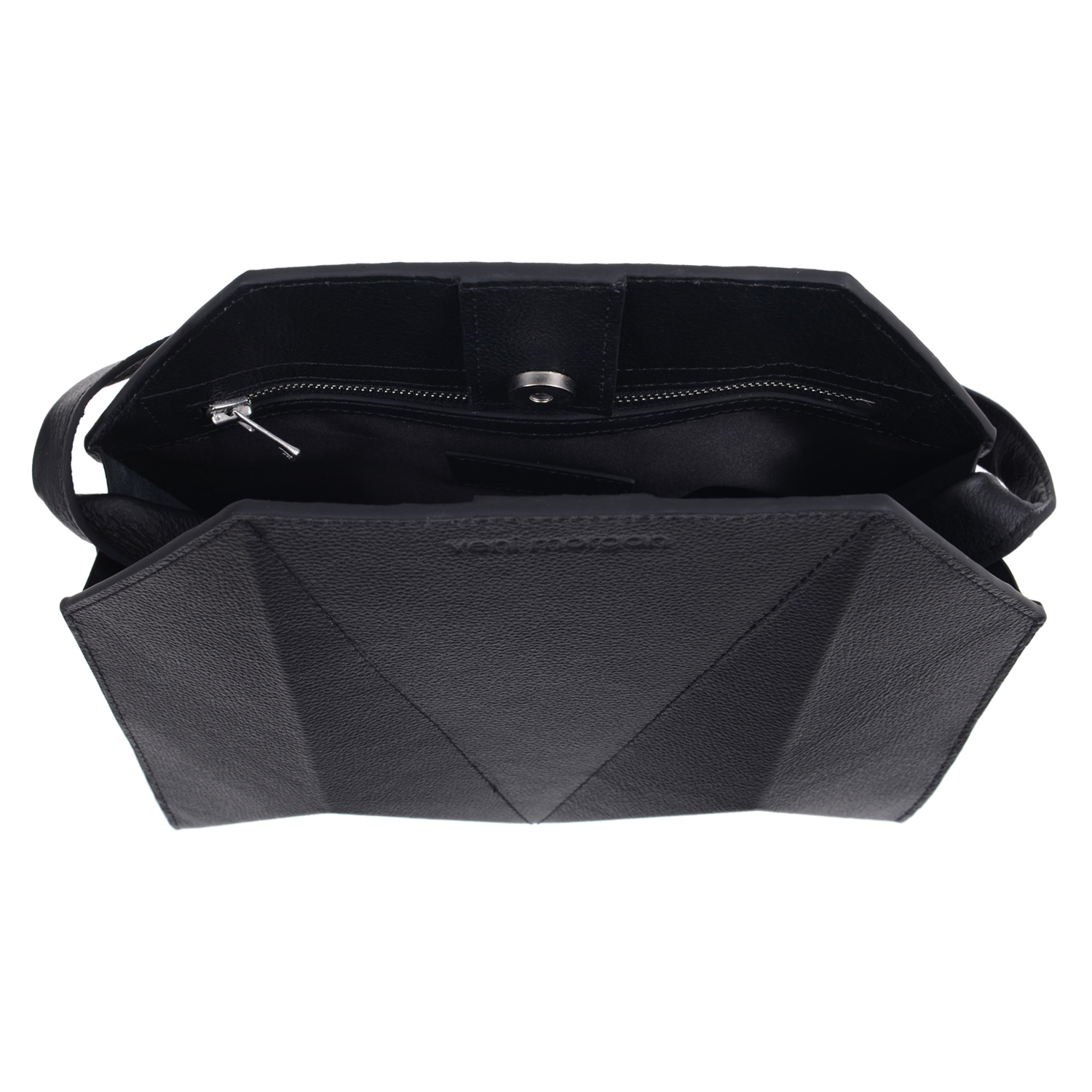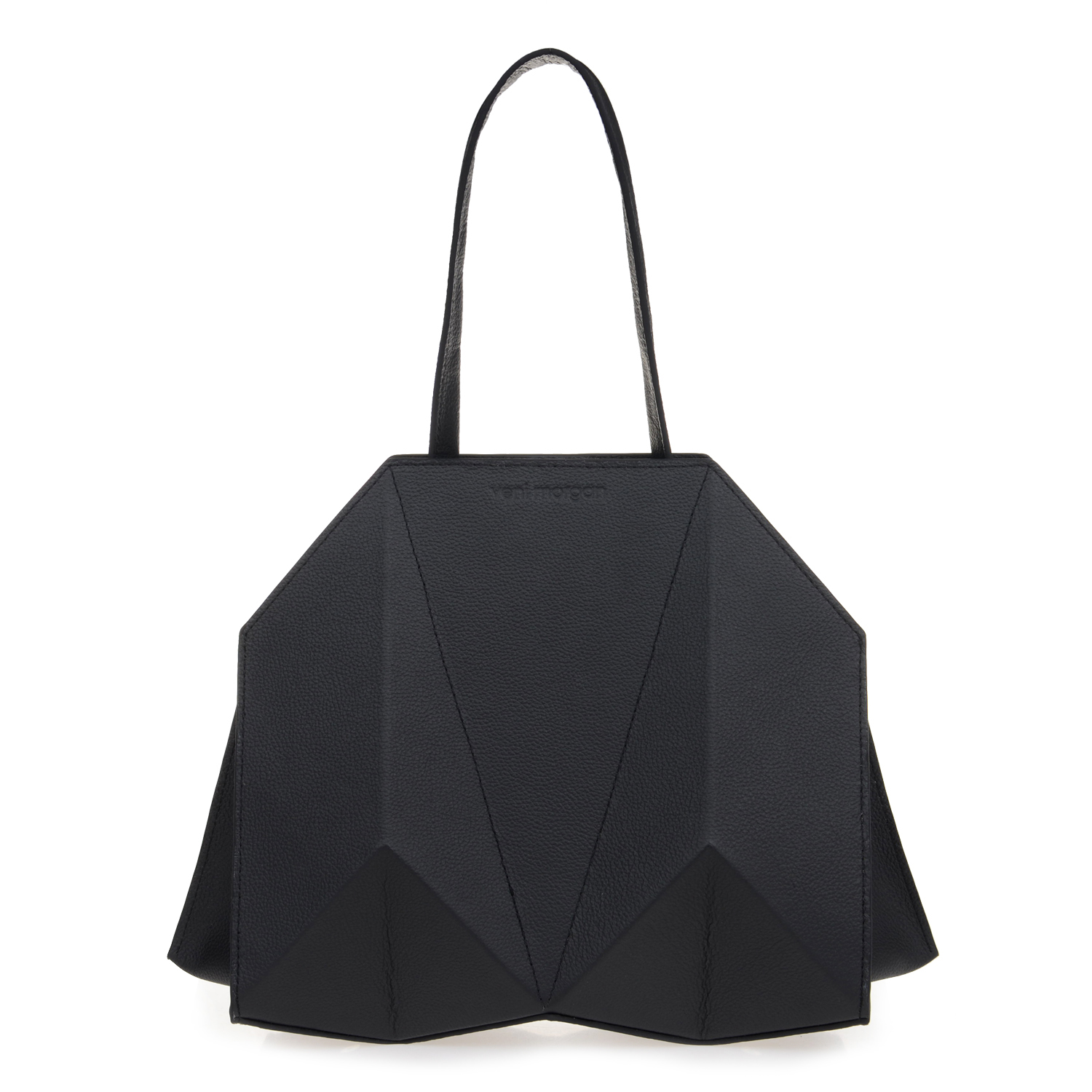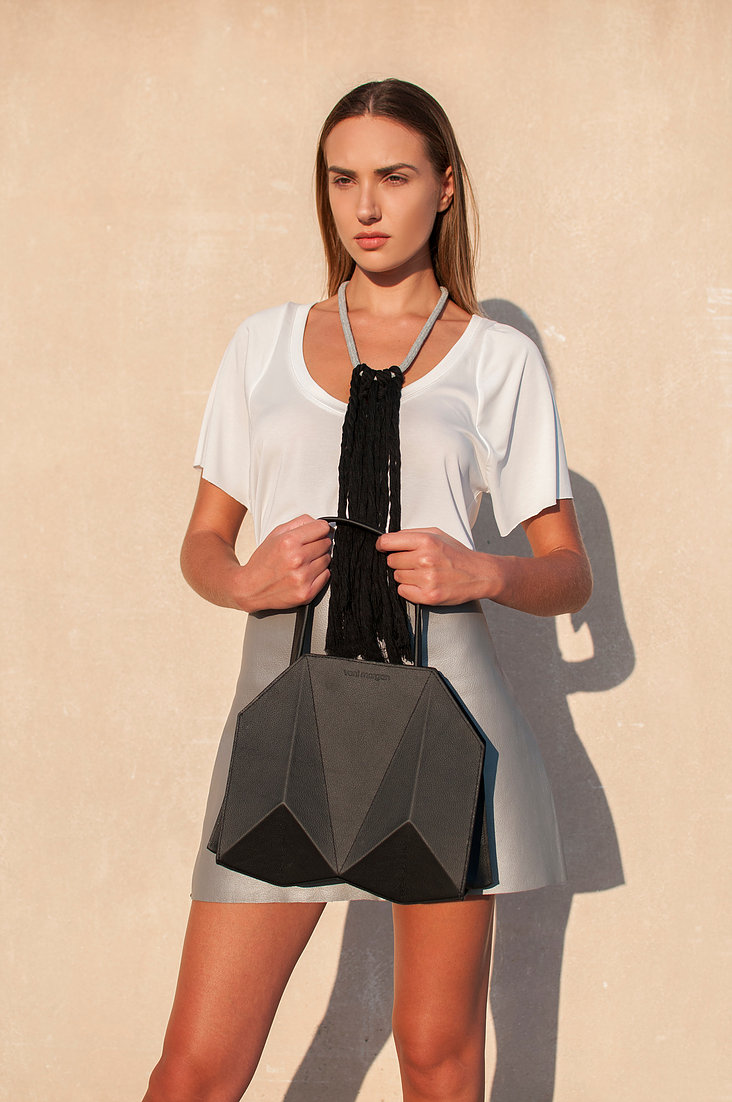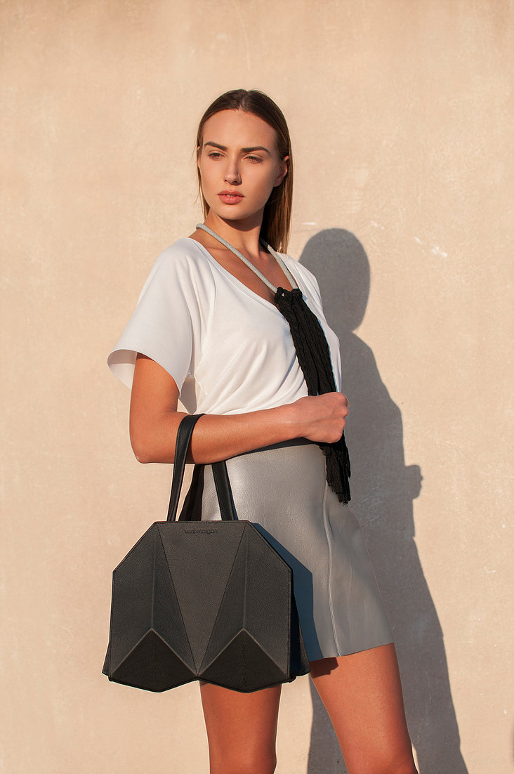 bako hand bag in black leather with nikel details and nikel zipper Inspired by Japanese origami, combined with contemporary, minimal design and created from the finest materials, the bako bag will uniquely complete your minimal outfit product details bag Length : 28cm Height : 27cm Depth : 14cm model Height : 1,77 m