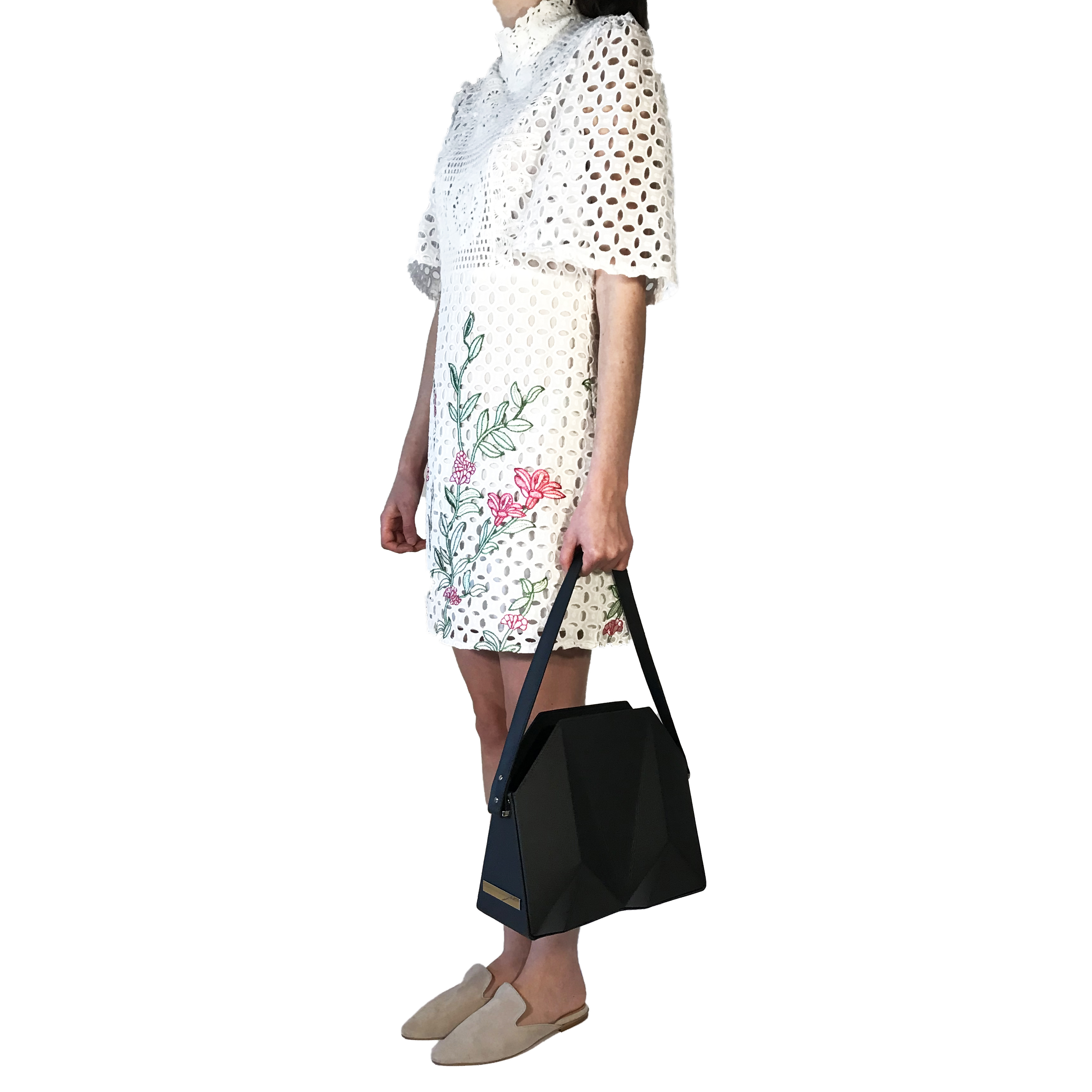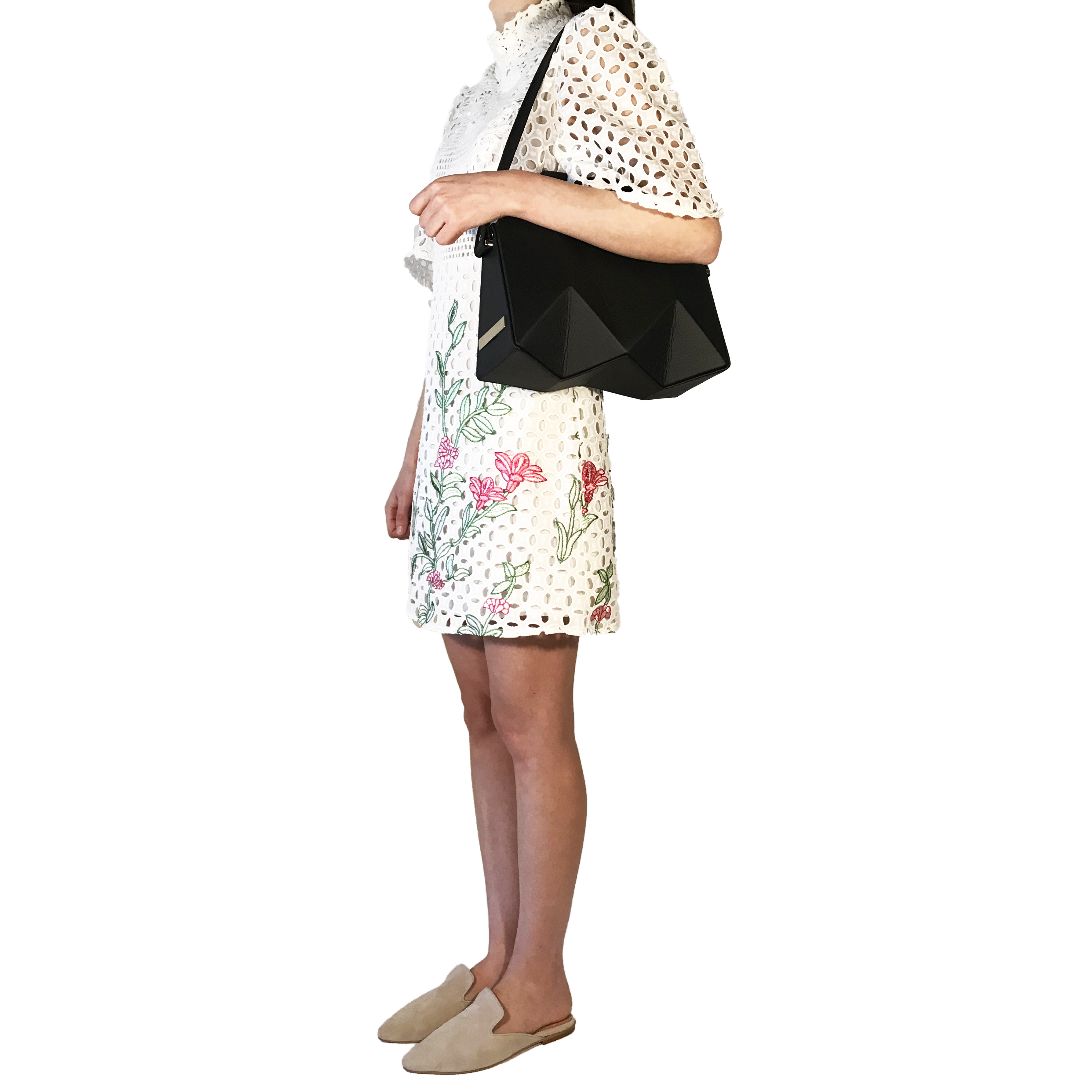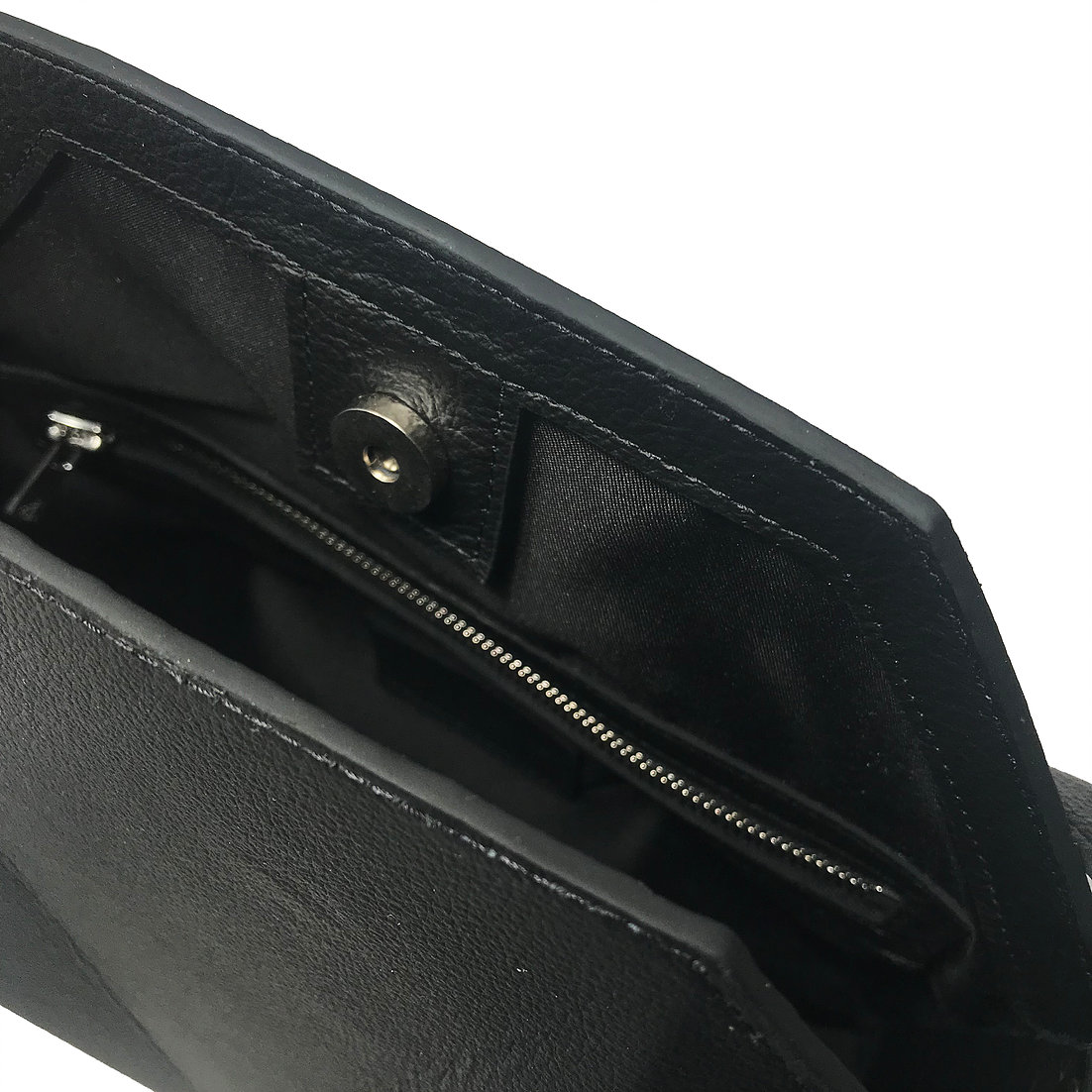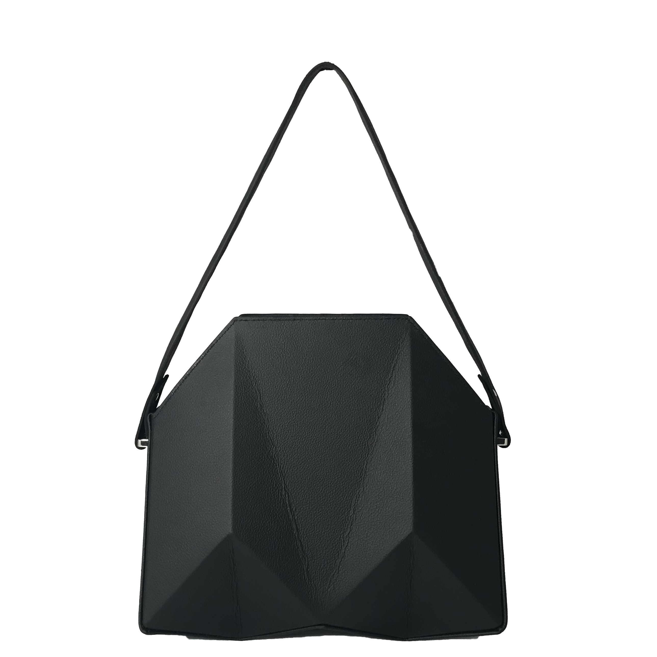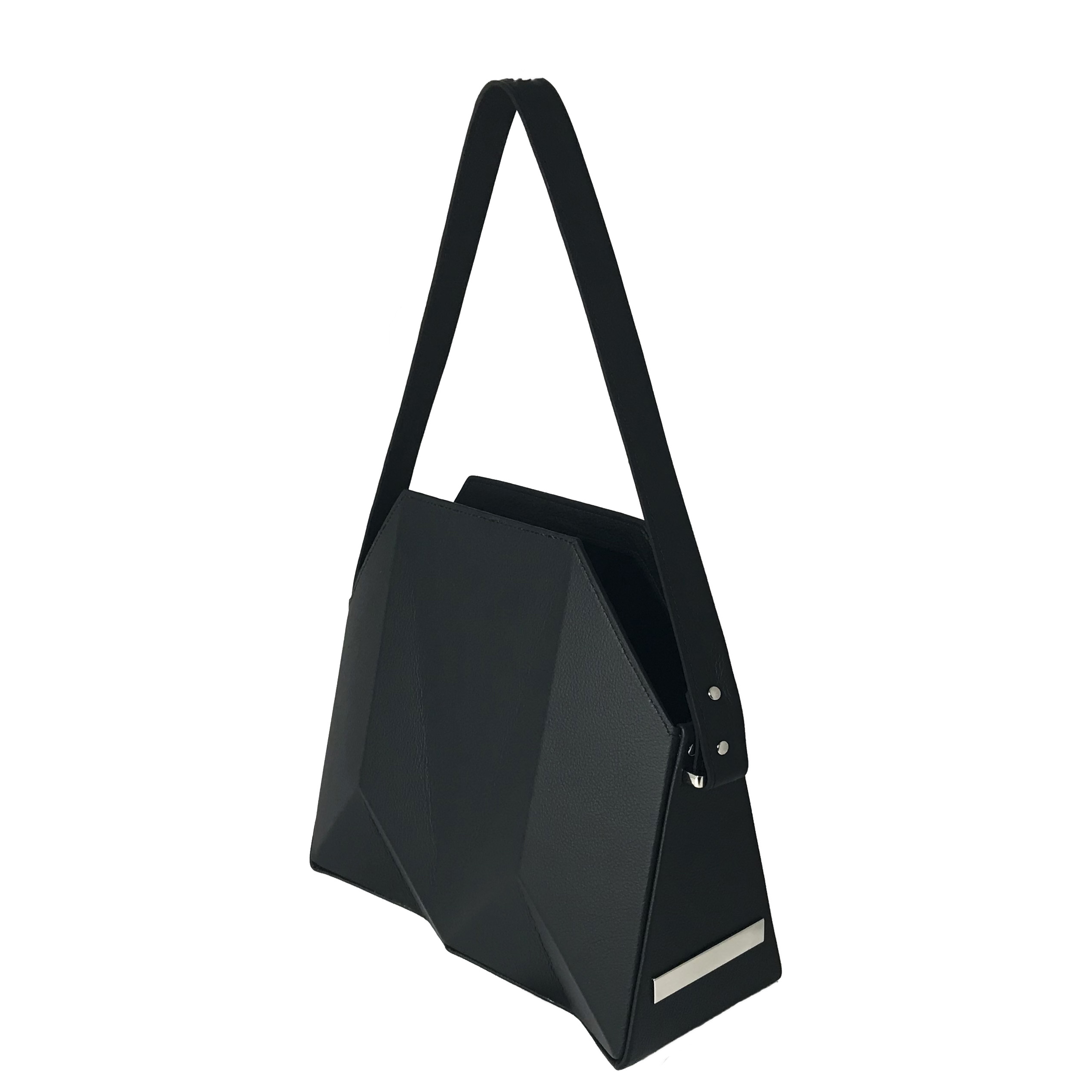 bako hand bag in grain black leather with nikel details and nikel zipper Inspired by Japanese origami, combined with contemporary, minimal design and created from the finest materials, the bako bag will uniquely complete your minimal outfit product details bag Length : 28cm Height : 27cm Depth : 14cm model Height : 1,67 m