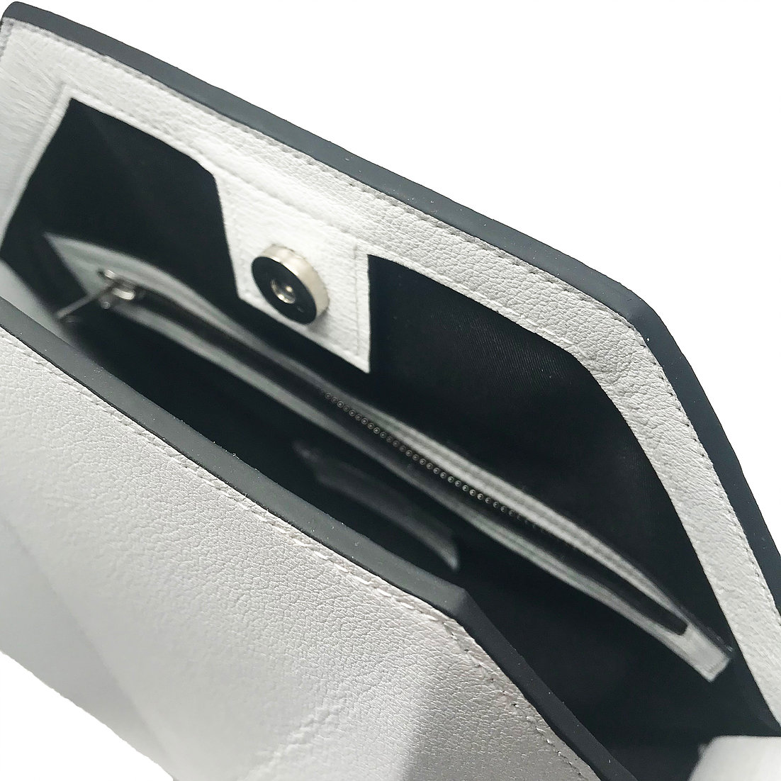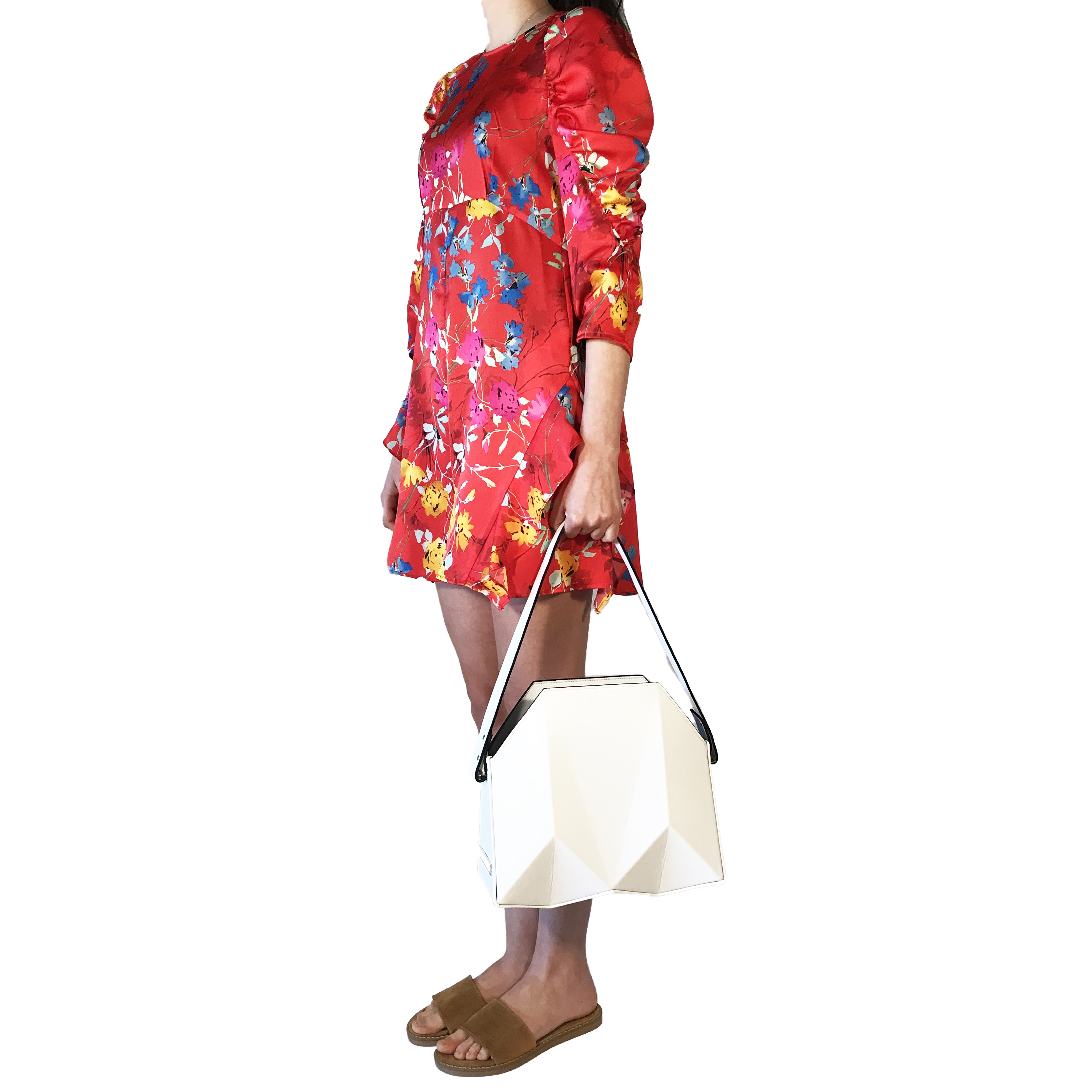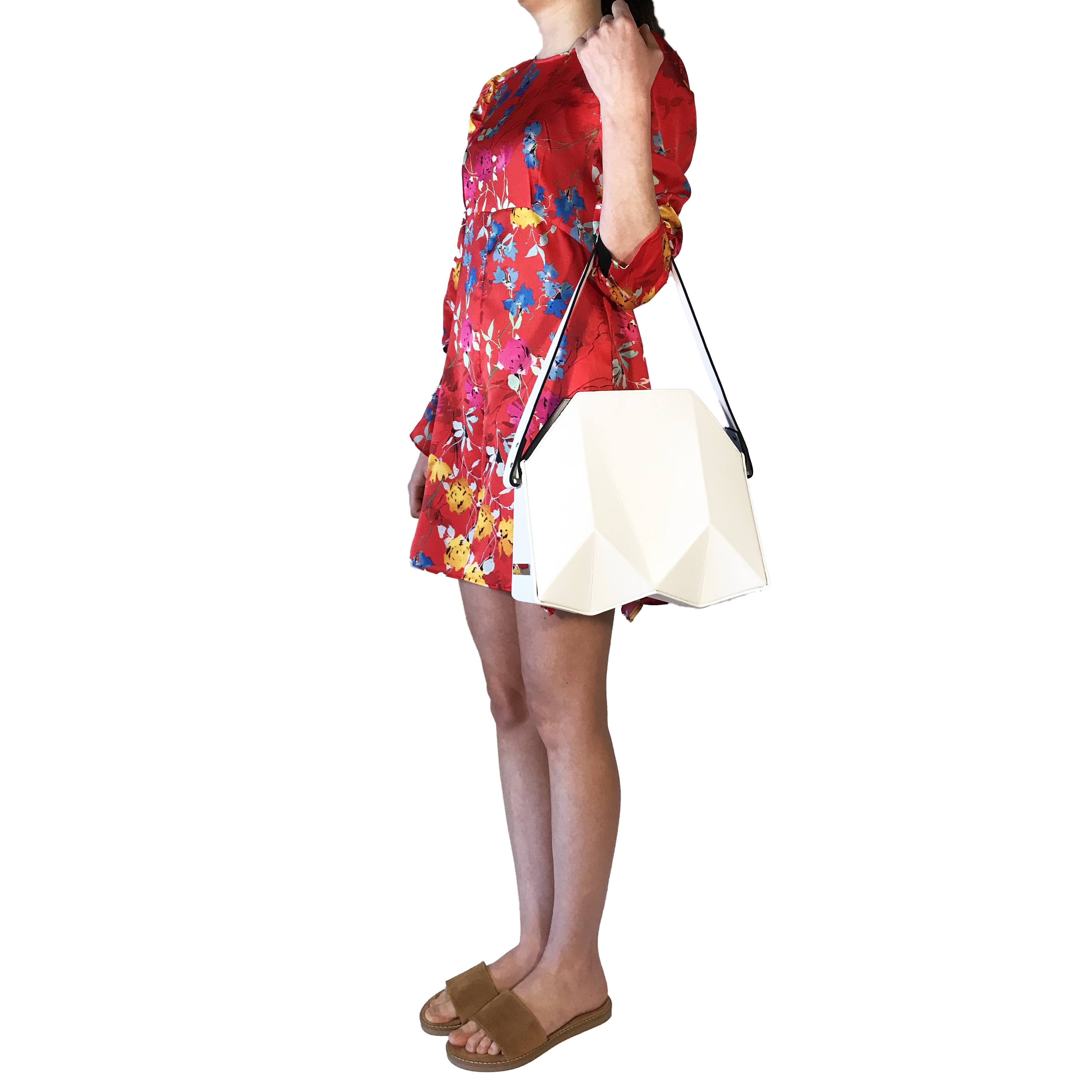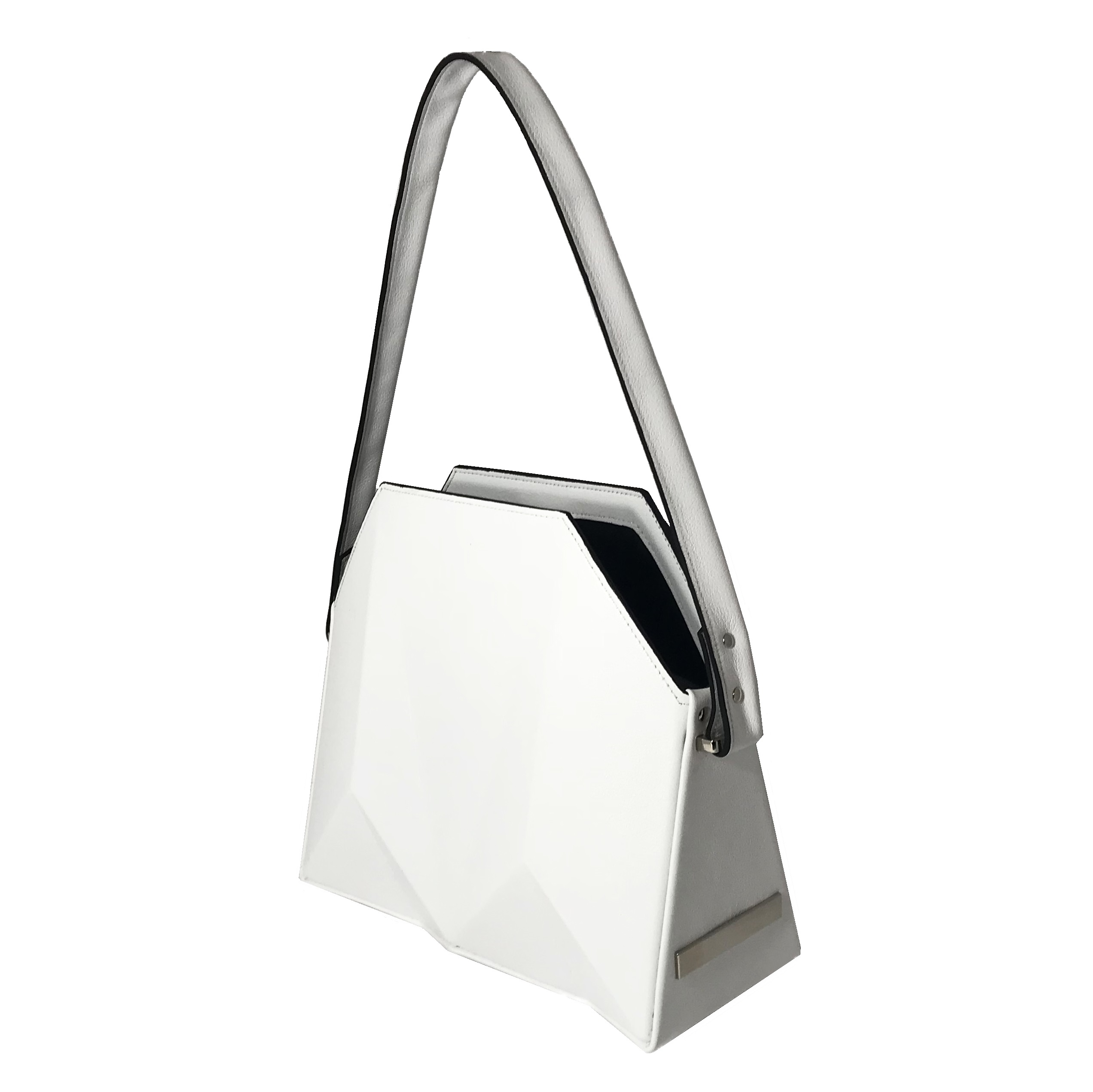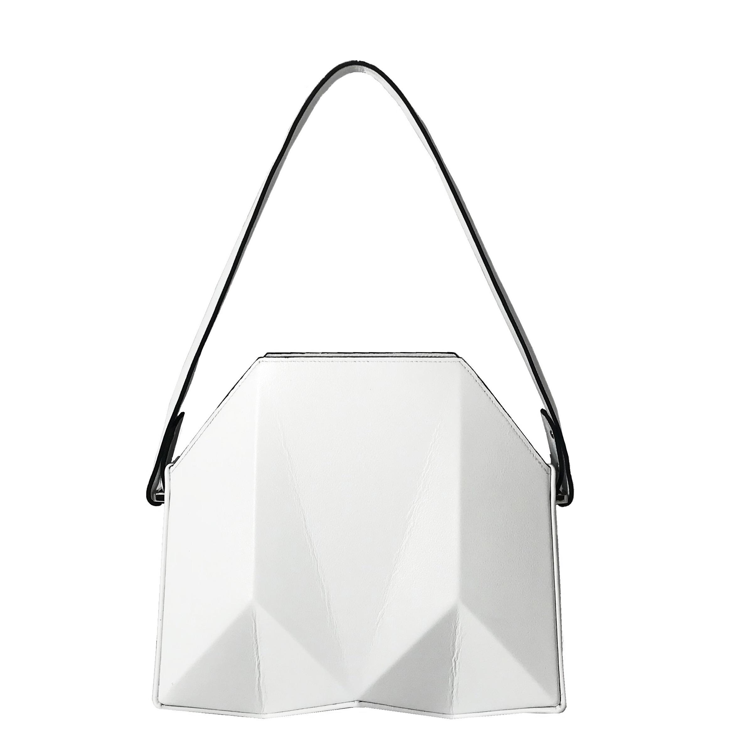bako hand bag in shiny white leather with nikel details and nikel zipper Inspired by Japanese origami, combined with contemporary, minimal design and created from the finest materials, the bako bag will uniquely complete your minimal outfit product details bag Length : 28cm Height : 27cm Depth : 14cm model Height : 1,67 m