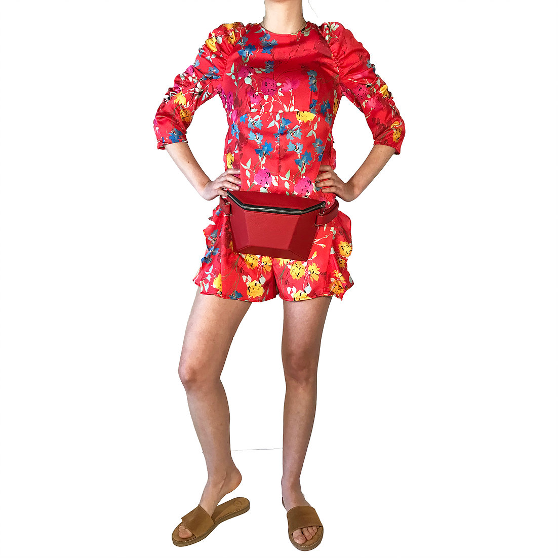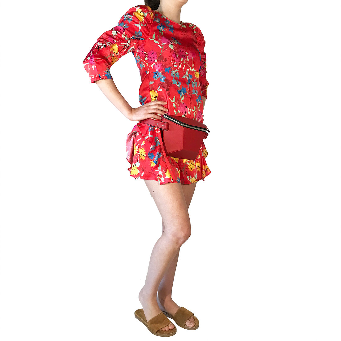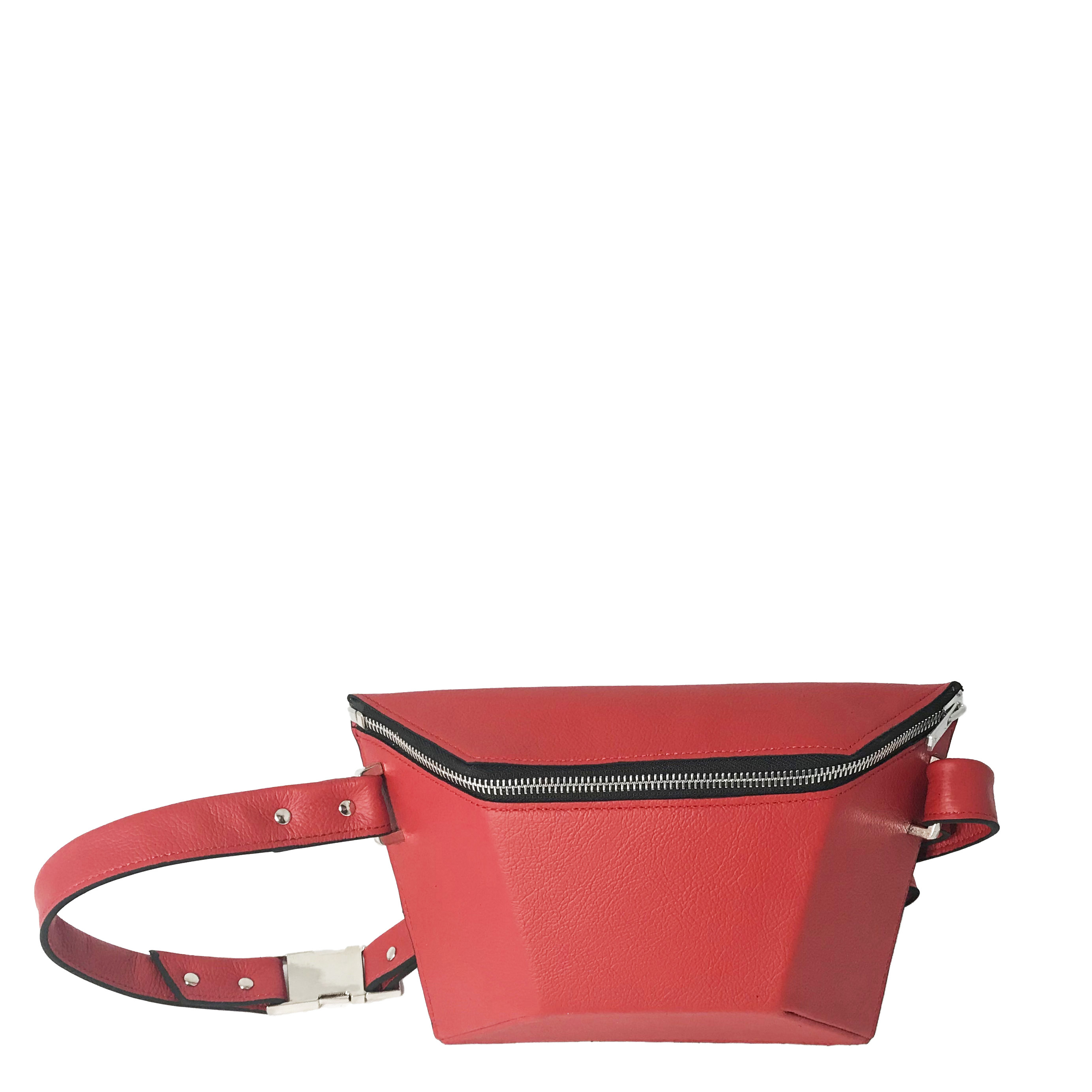 bani belt bag in red full grain leather with nikel details and nikel zipper Inspired by Japanese origami, combined with contemporary, minimal design and created from the finest materials, the bani bag will uniquely complete your minimal outfit product details bag Length : 22cm Height : 14cm Depth : 6.5cm model Height : 1,67 m