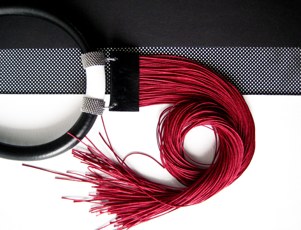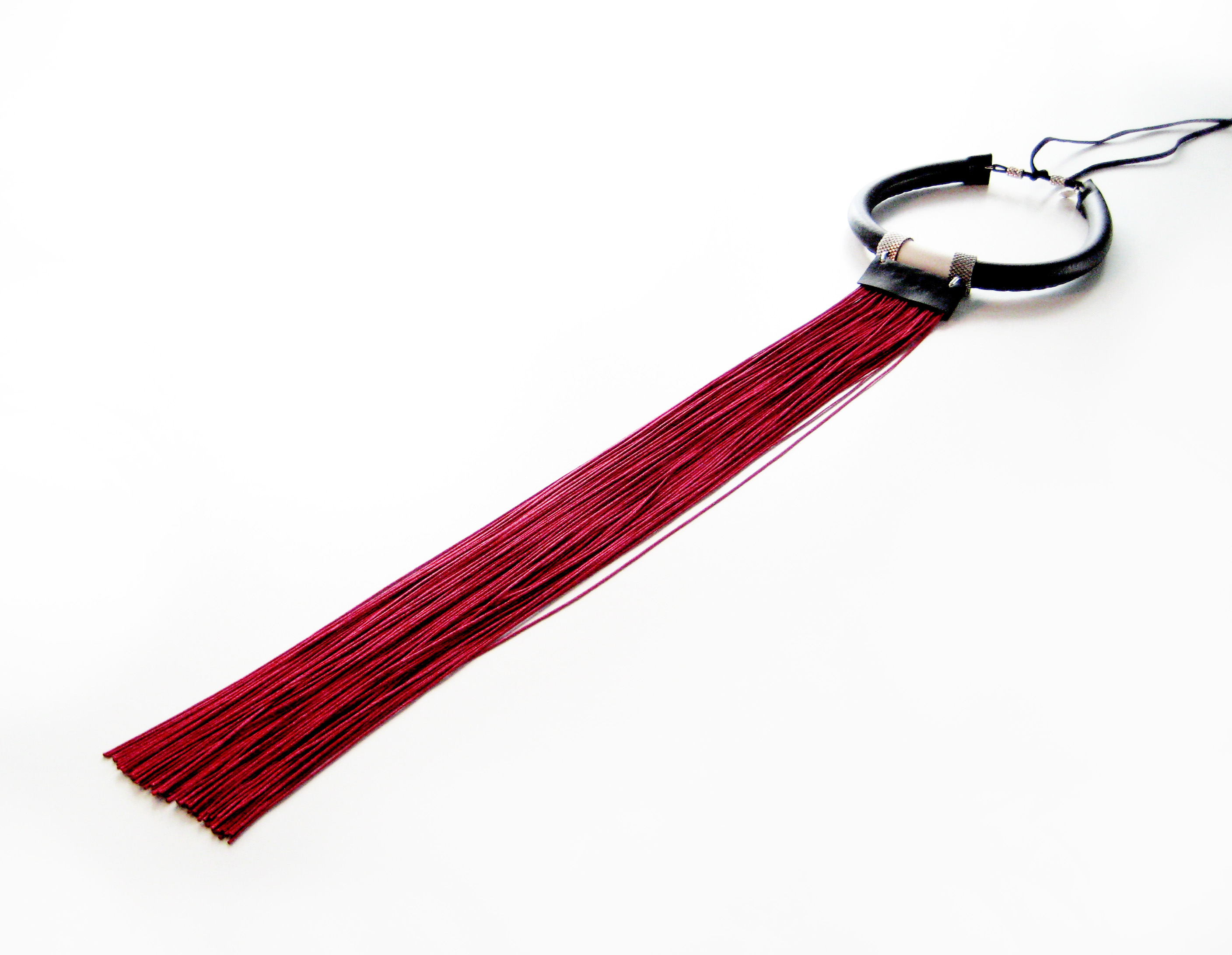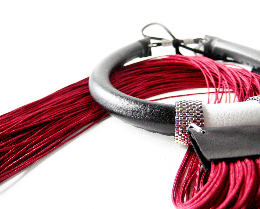 Bold Choker Long Fringes necklace CODE: NCK_BCF Black and white cocker necklace in vegan leather Two bands refined with beads Long tassel in dark red Visible seams Seductive Feminine Provocative - Double sided wearable - DETAILS I personally design and realize this necklace by hand in Italy. Vegan leather is cut in vivo and sewn with regular stiches. The central bands is made by cylindric glass beads, worked with Peyote stitch. Long tassel is made by hand with a synthetic rope that do not frays. The collar is semi-rigid and adjustable. Easy to wear: you will forget to wearing that, you′ll see ;) MATERIALS Necklace: black-white faux leather, black/dark red nylon threads, high quality palladium-plated cylindric glass beads, leather lace. Pendant: black faux leather, dark red synthetic rope DIMENSIONS Circumference about 17 in (44 cm) Lenght 23 in (58 cm) Tubular thick about 0.47 in (1,2 cm) ► This product is made to order for you. The product you will receive may not be identical to the one in the picture although done with the same technique and the same materials. I will reproduce every single piece for you. You will receive a unique product; small differences or imperfections are a guarantee of an artisan product, authentic and original. ► Just worn the necklace may seem rigid, this effect is given by the internal structure of the tube but will disappear in a short time and thanks to the warmth of your body ► The necklace will come to you in a black network bag, I suggest to store it there to always keep it in good shape. At the end of this page, I give you all the tips on how to take care of. ► If you want to customize this product (colors, lenght, circumference, etc.), you can do by contacting me before placing your order. TO PRESERVE YOUR JEWEL: - do not expose too much to the sunlight - avoid the contact with detergent, cold cream, perfume or colored fabrics that could be discolored on it - clean the beads of stud earrings regularly with a soft and dry rag - clean the faux leather only with neutral detergents - keep in its original package - the fringes can be ironed at a low temperature, covered by a linen fabric. Please, take care not to iron the faux leather fabric too.