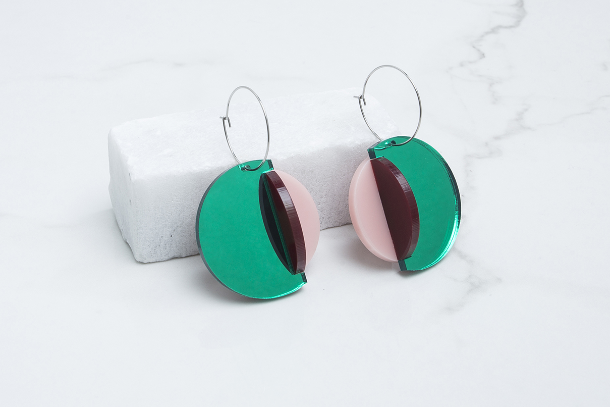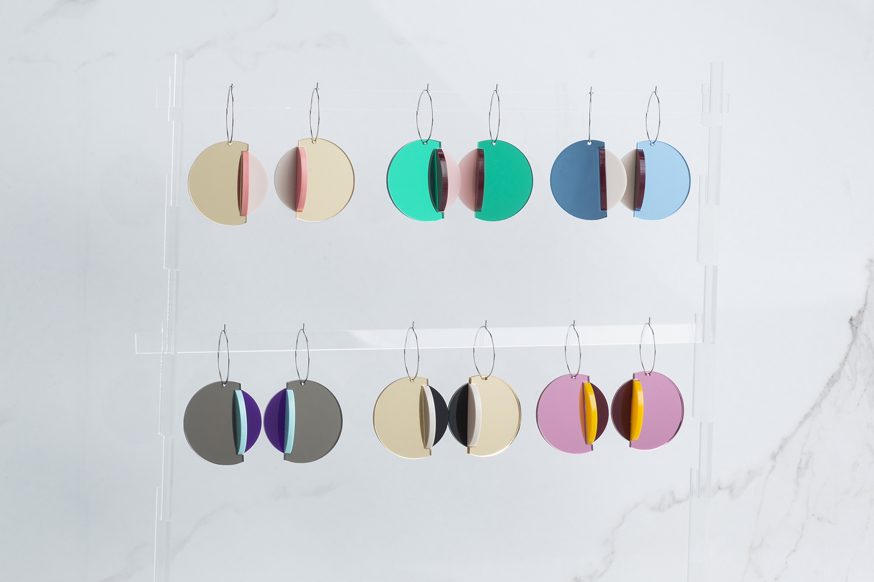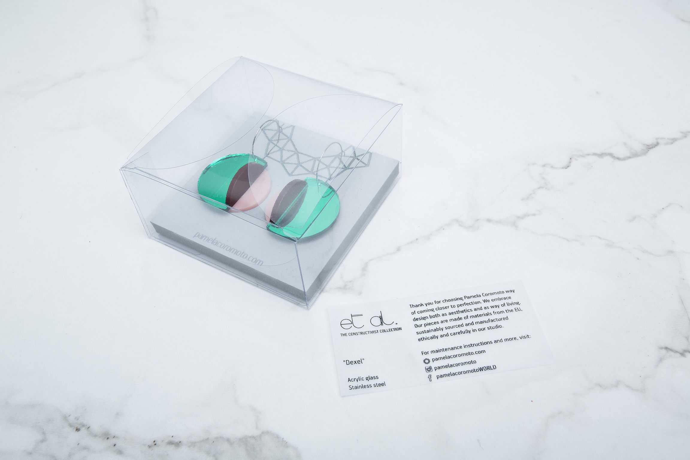 ″Dexel″ statement earrings are made to stand you out! Inspired by Constructivist artist Walter Dexel, this piece set a composition of rounded overlapped and intersected forms, the lights and reflections of the materials are constantly changing with the user′s moves. We embrace design both as aesthetics and as way of living. Therefore, all pieces are made with the smallest footprint possible, sustainably sourced materials and manufacture ethically in our studio. We combine digital fabrication with traditional handcraft skills in order to customize these storytelling pieces, carefully assembled by hands of the designer. Available in six different combination of colors/finishings: -Light Blue mirror, beige and bordeaux -Pink mirror, bordeaux and mustard -Green mirror, pale rose and bordeaux -Gold mirror, beige and coral -Bronze mirror, purple and mint -Gold mirror, black and beige Made of high quality cast acrylic 3mm / Stainless Steel 25mm hoop (hypoallergenic) Diameter: 3,9cm Depth: 21,5cm