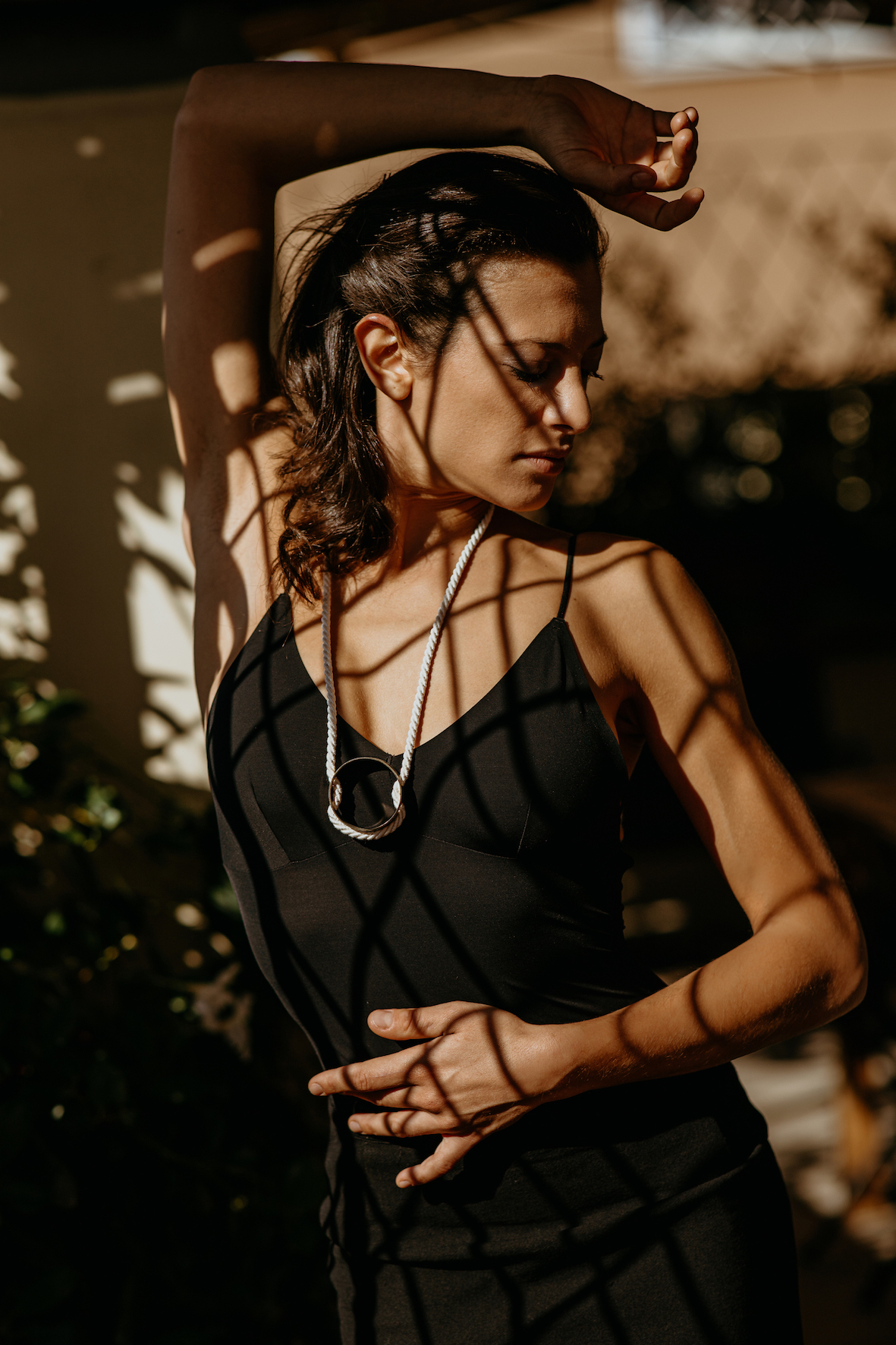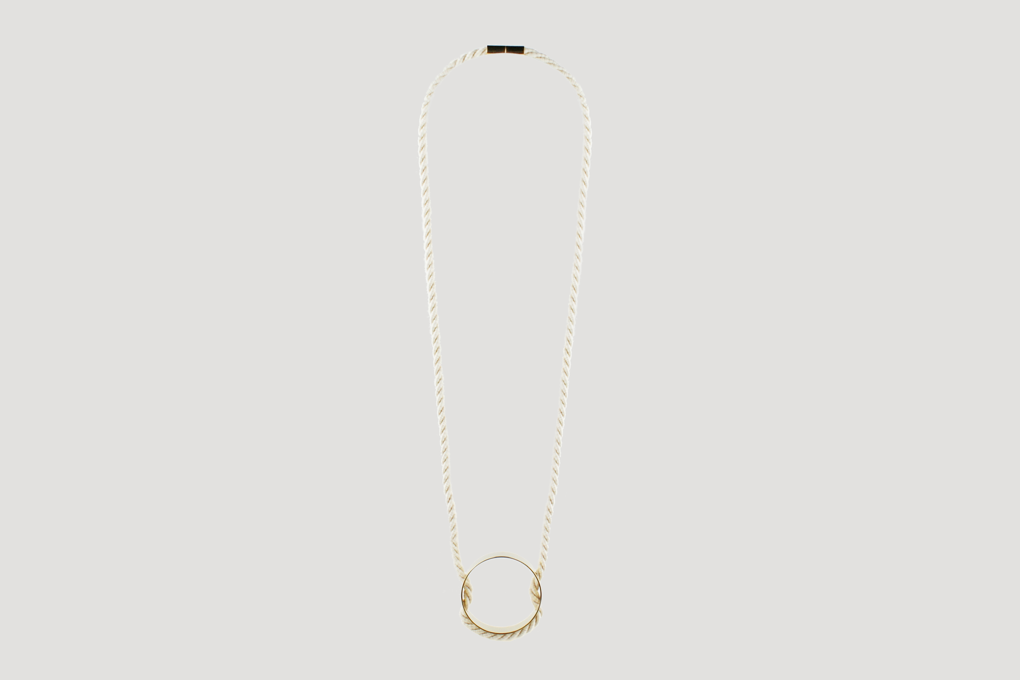 Specifics: Handmade necklace Gold plated brass circle Cotton twisted rope Gold plated magnetic clasp Length: circa 35cm Width: circa 5cm Weight: circa 33gr