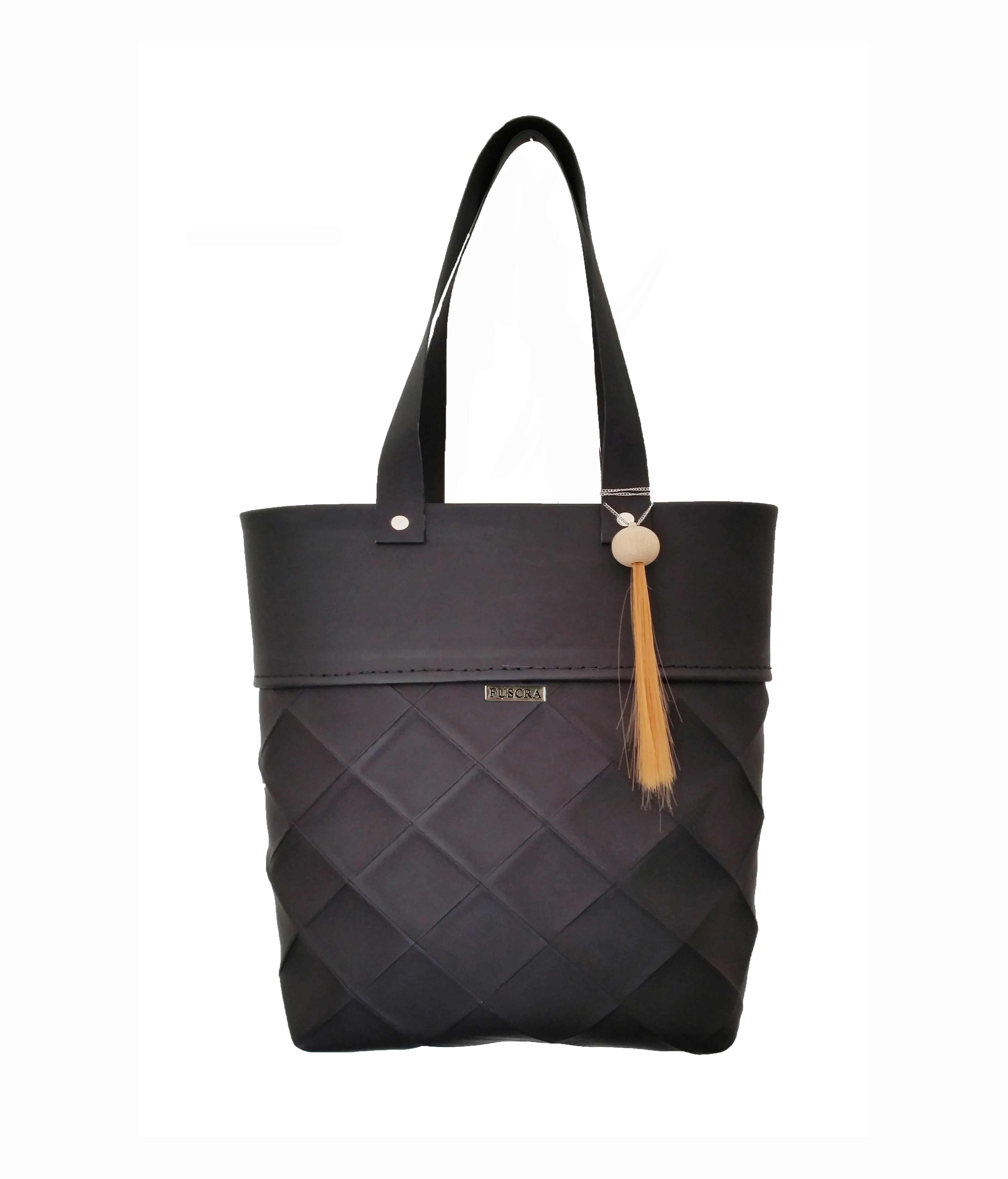 Eco Leather Tote with minimal style and origami style. All our designs are protected by copyright! This material made in Italy is born from recycled vegetable leather to restore life to a unique material. it is hard like leather. but remains thin. 12/10 mm. is velvety to the touch. - size: 26 x 32 x 12 cm approximately - color: please select black or beige handmade stitching on the front, on lower edge and on the back. tassel hanging: the decoration on the front will be with a random color. You can specify the size of the handles desired between the seller notes in the order...or it will made as in the picture.