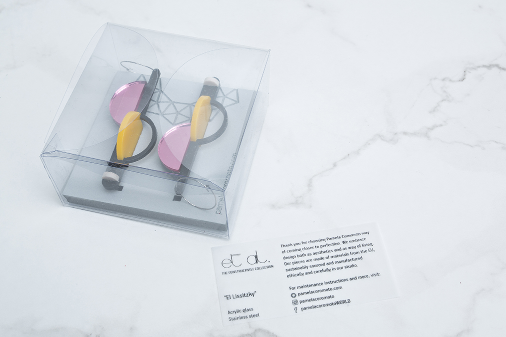 El Lissitzky Statement Earrings, are distinctive, edgy and unique. The perfect finish for every outfit, a delightful composition of forms, spatiality, lights and reflections inspired Constructivist artist ″El Lissitzky″ and his strong geometrical language. We promise you would love it from all points of view!
