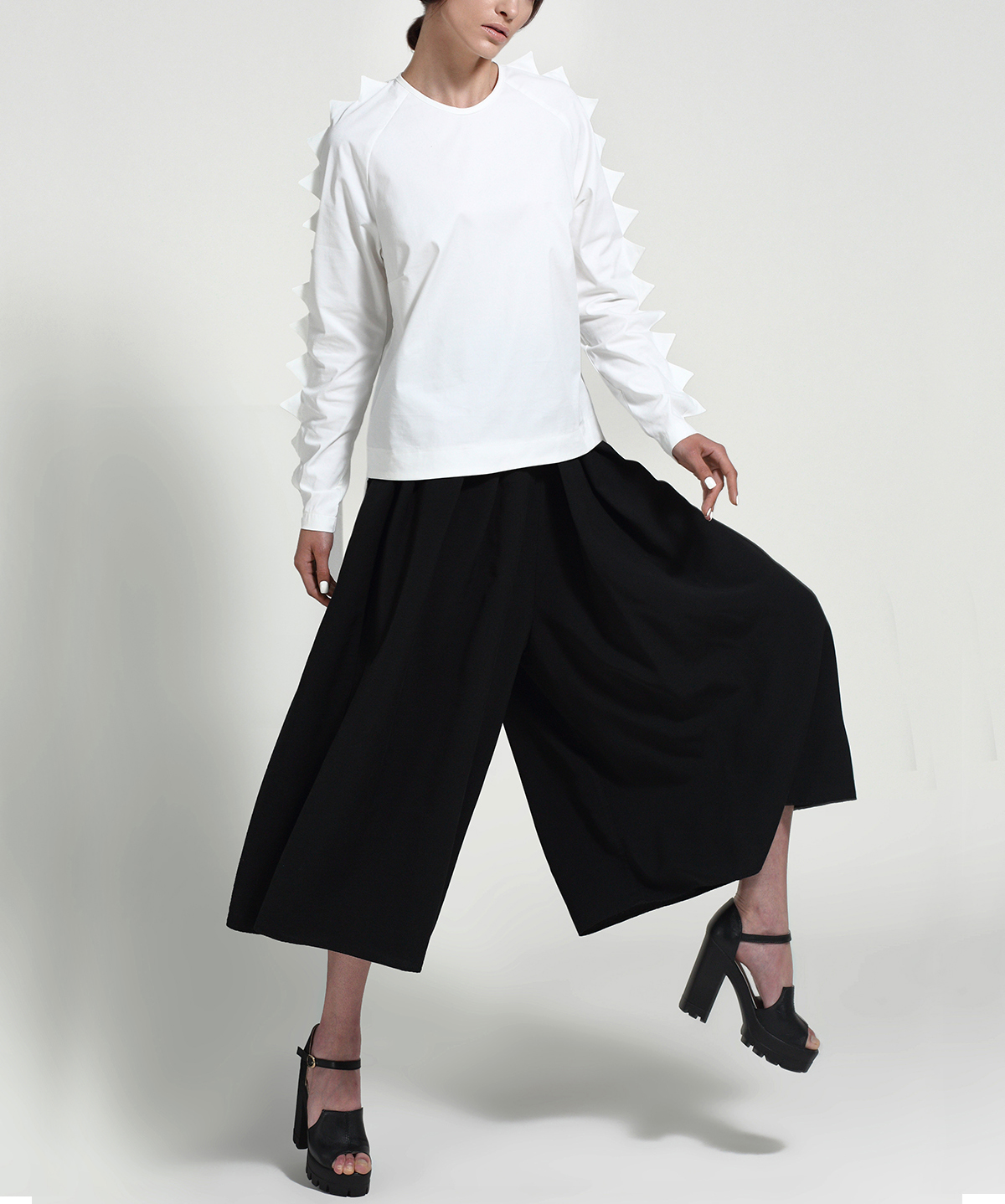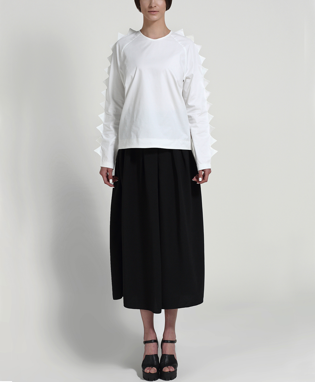 Shirt with an unique design, reproduced by the geometric elements on the sleeves. This creation is appropriate for a woman who wants to get out of classical patterns, accessing the futuristic fashion dimension.