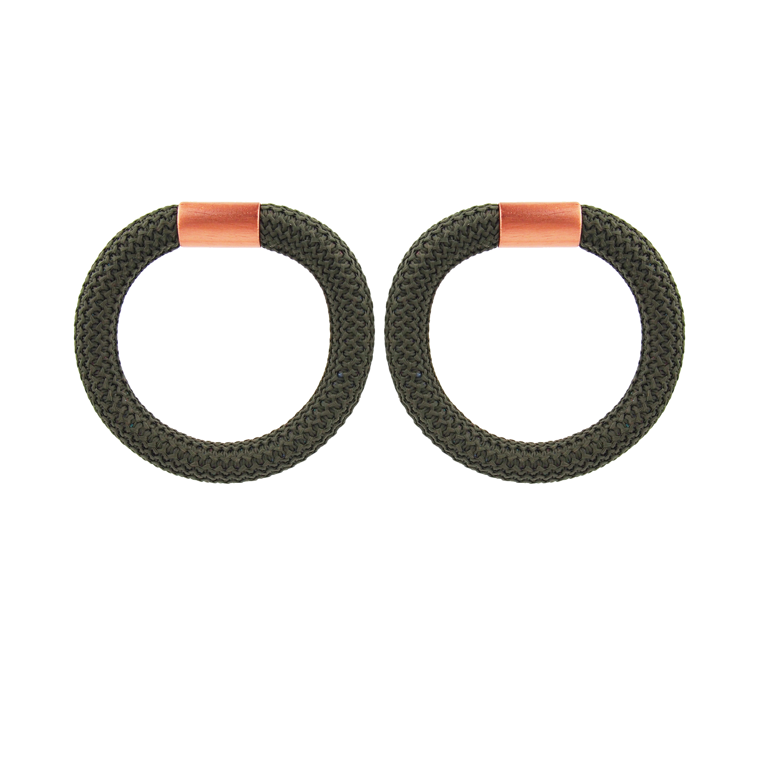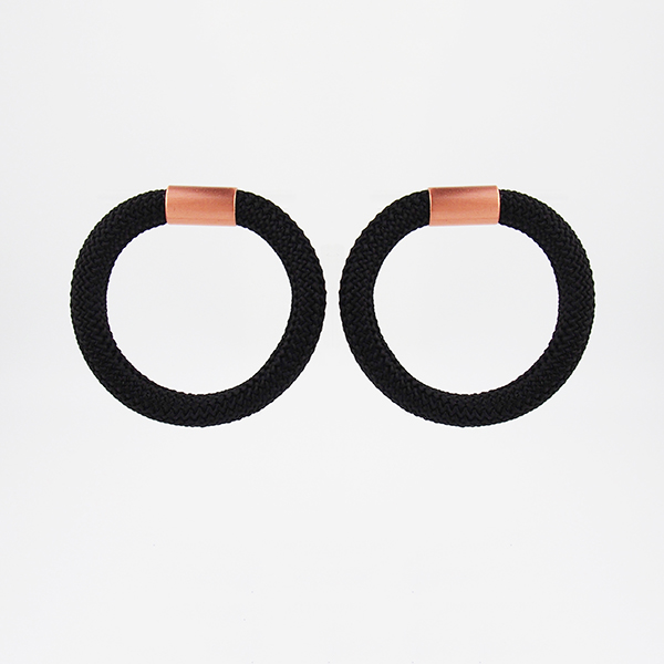 Specifics: - Handmade earrings - Coated copper - Nautical cord - Brass pins - Nickel free - Rubber stopper - Length: circa 17cm - Width: circa 18cm - Weight: circa 33gr - Ø 12mm copper tube