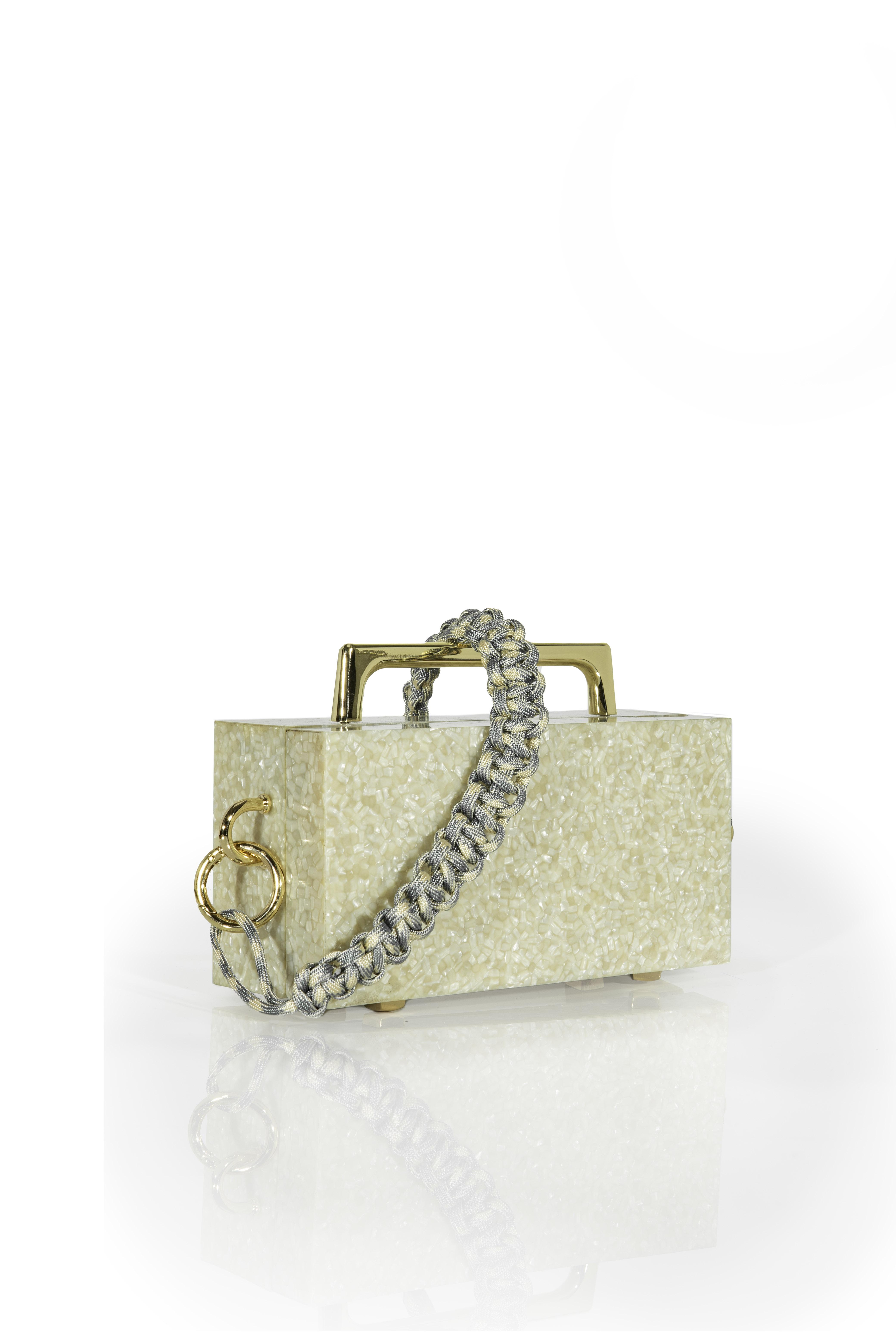 Main material : Cellulose Acetate (eco-friendly) Paracord strap Zink Alloy handle Gold colored metal hardware Shape: Rectangle Size: 20cm*10cm*7.5cm Color: White chocolate