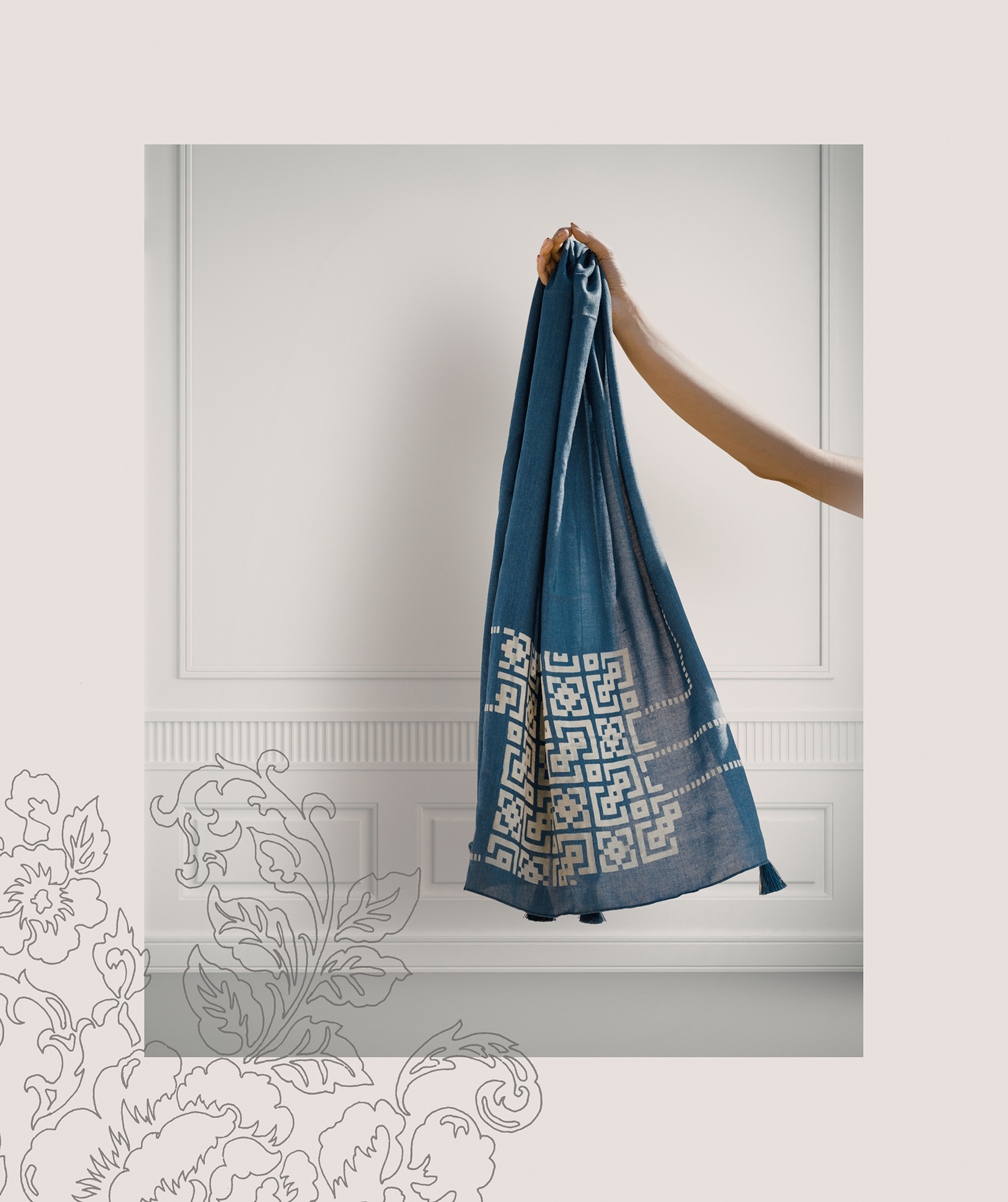 80% Cotton ~20% Polyester · Flock Printing / Digital Printing / Applique′ / Parchment Craft · Washable ( 20-30 Degree Water) · Iron Safe · Size: 85 x 190 —- 140 x 140 · Inspiration for designing the scarves came from different sources: Country’s Cultures, Geometric Shapes and more