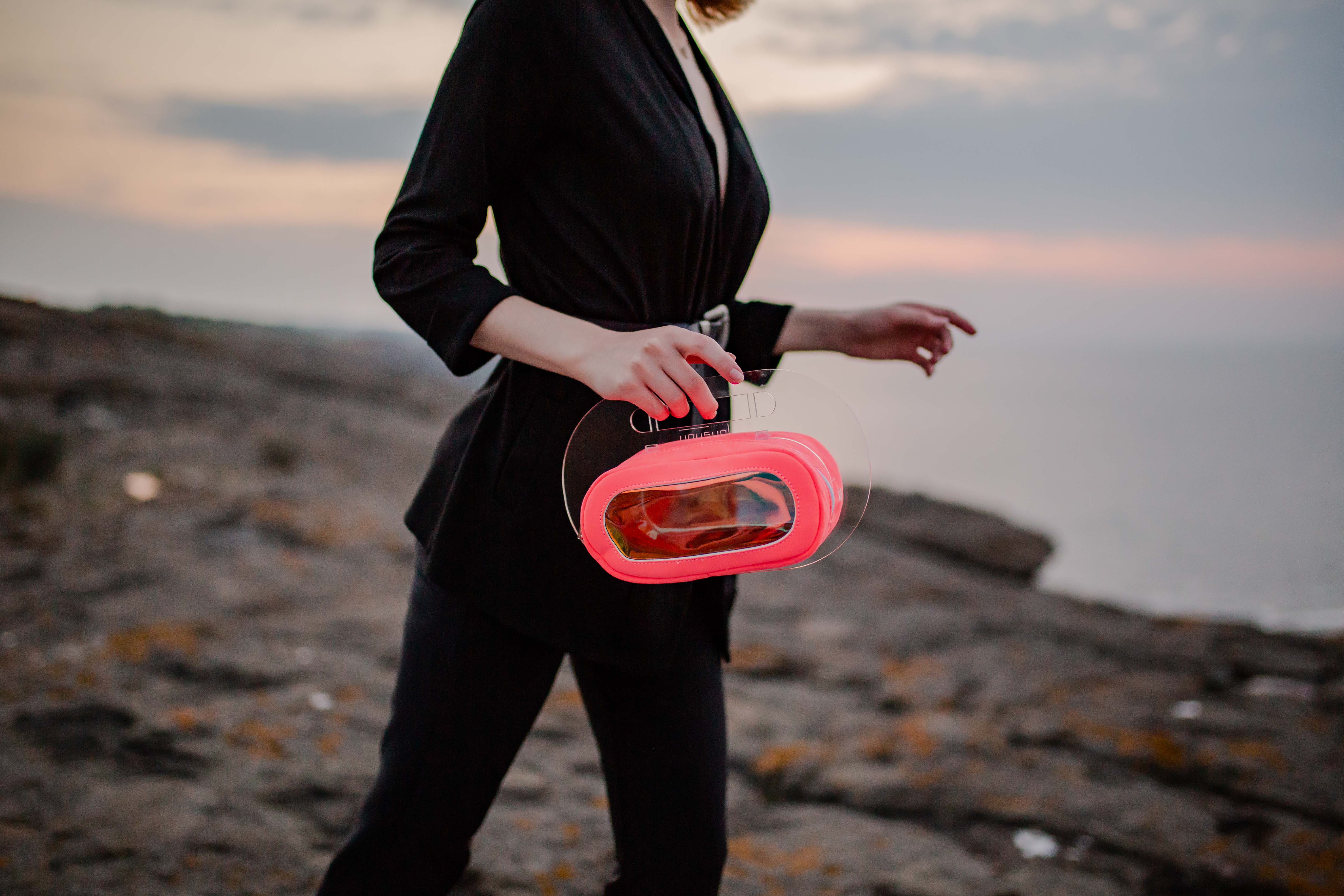 Find the muse in you like Euterpe- The Goddess of Muse- with our Neon Peach Fillet Bag. Free, Beautiful and most important Unusual. Attention is guaranteed! Attached to the Transculent Plexiglass Front&Back is Faux Sued Leather with Iridescent PVC Plexiglass Frame Radius 27 cm Bag Radius is 20,5 cm