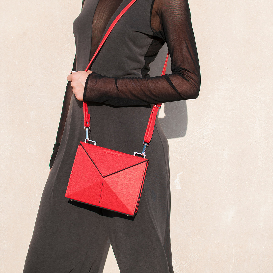 noshi shoulder bag in red leather with nikel details Inspired by Japanese origami, combined with contemporary, minimal design and created from the finest materials, the noshi bag will uniquely complete your minimal outfit product details bag Length : 22cm Height : 12.5cm Depth : 6.5cm model Height : 1,77 m
