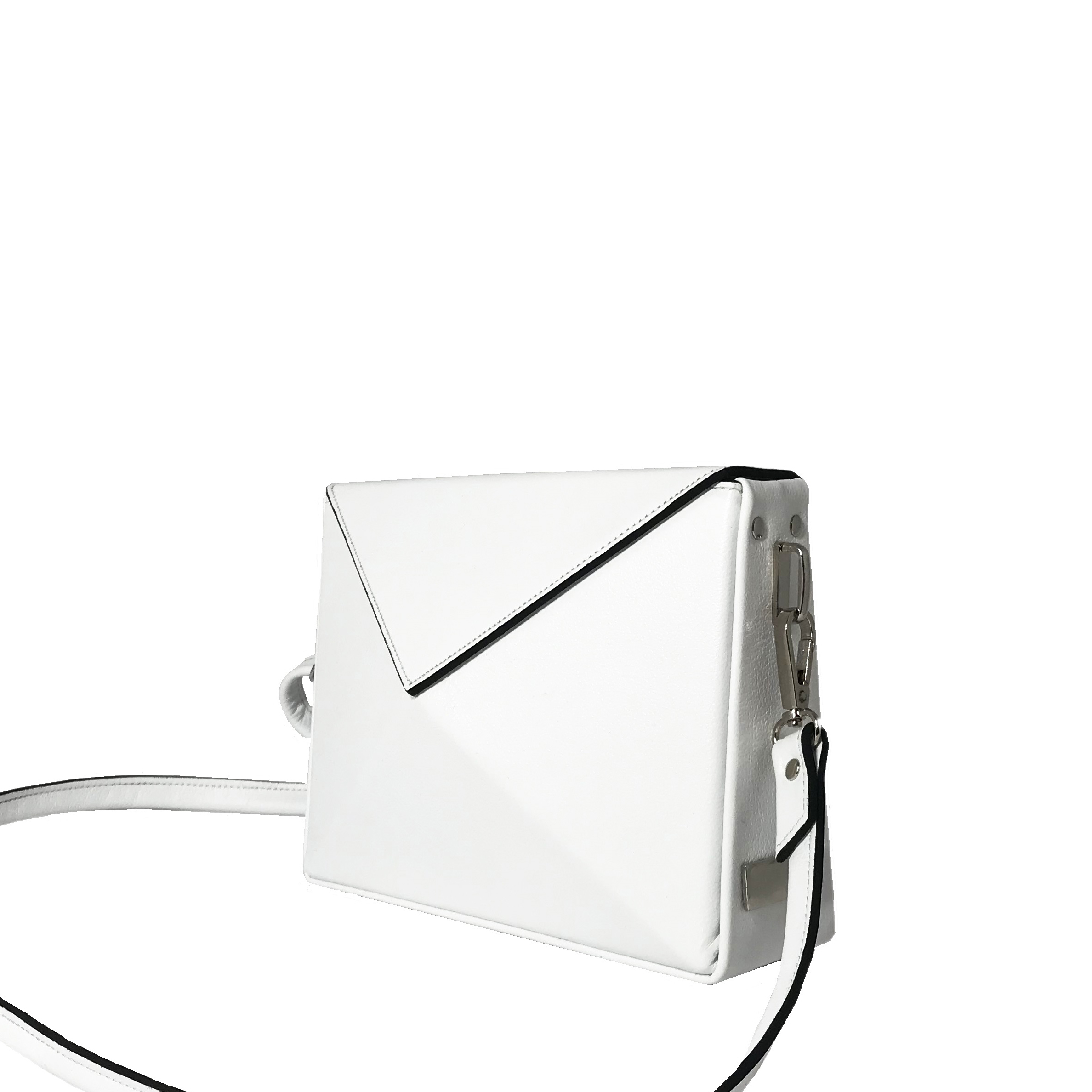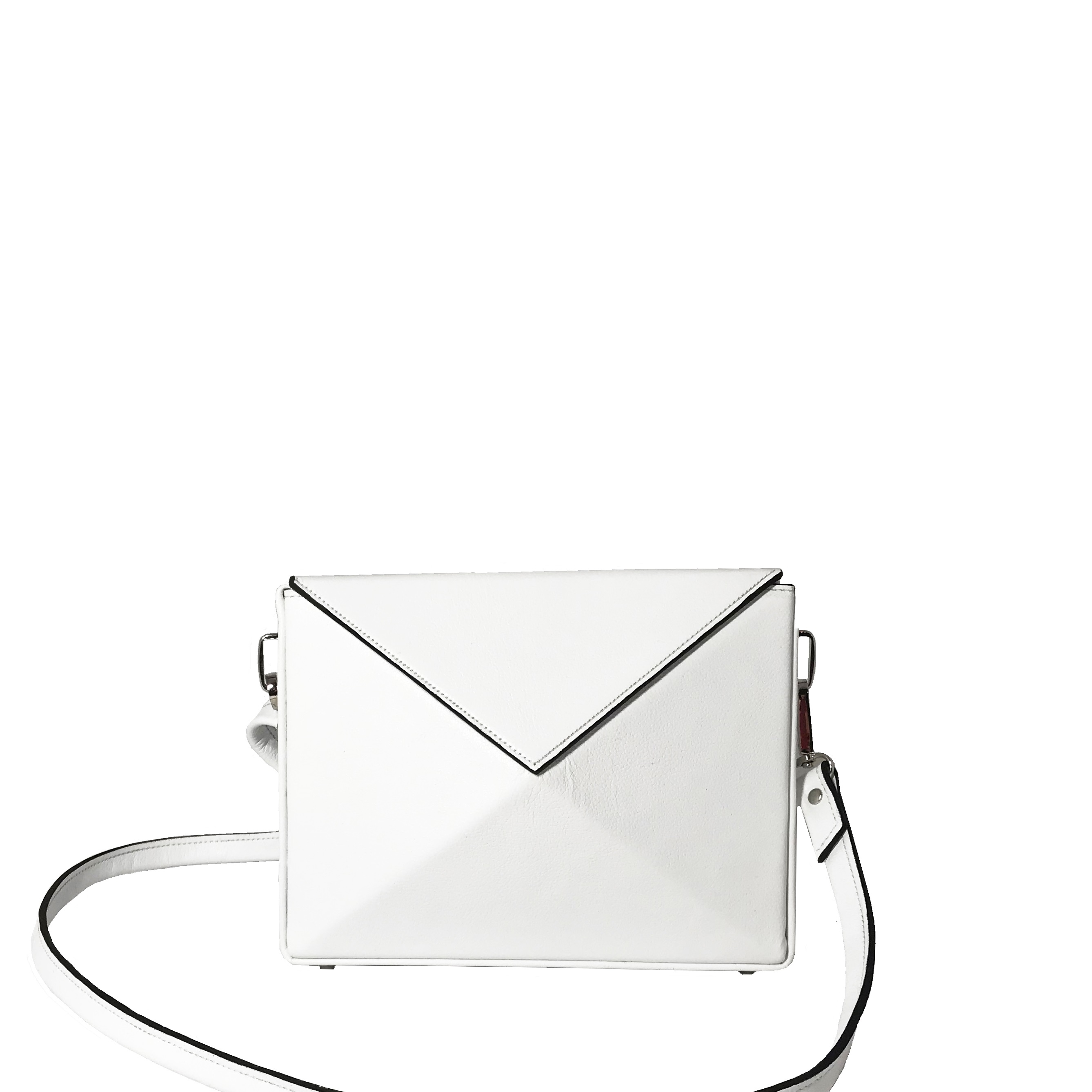 noshi shoulder bag in white leather with nikel details Inspired by Japanese origami, combined with contemporary, minimal design and created from the finest materials, the noshi bag will uniquely complete your minimal outfit product details bag Length : 22cm Height : 12.5cm Depth : 6.5cm model Height : 1,77 m