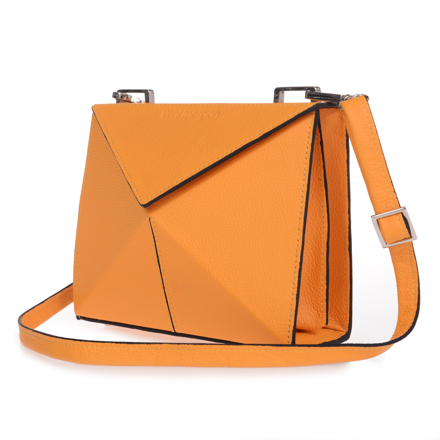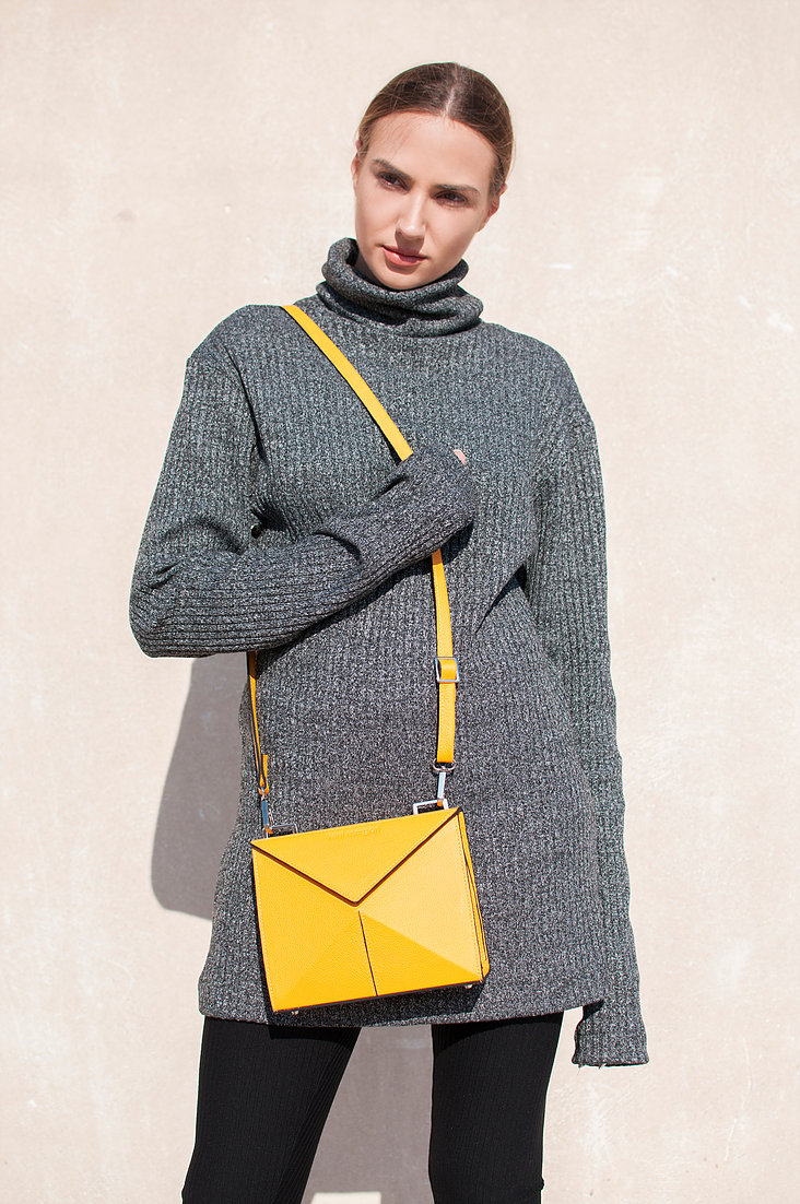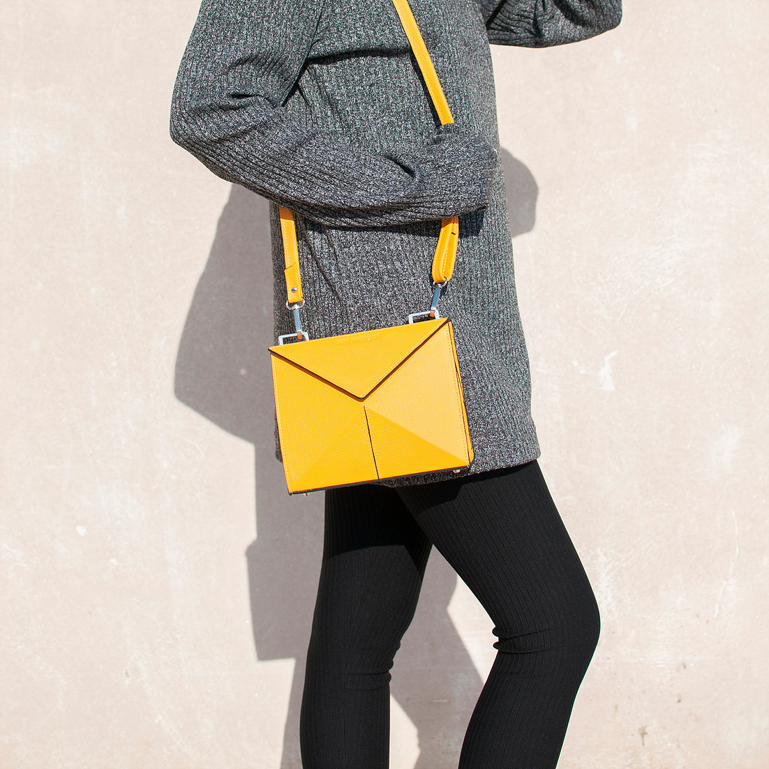 noshi shoulder bag in yellow leather with nikel details Inspired by Japanese origami, combined with contemporary, minimal design and created from the finest materials, the noshi bag will uniquely complete your minimal outfit product details bag Length : 22cm Height : 12.5cm Depth : 6.5cm model Height : 1,77 m