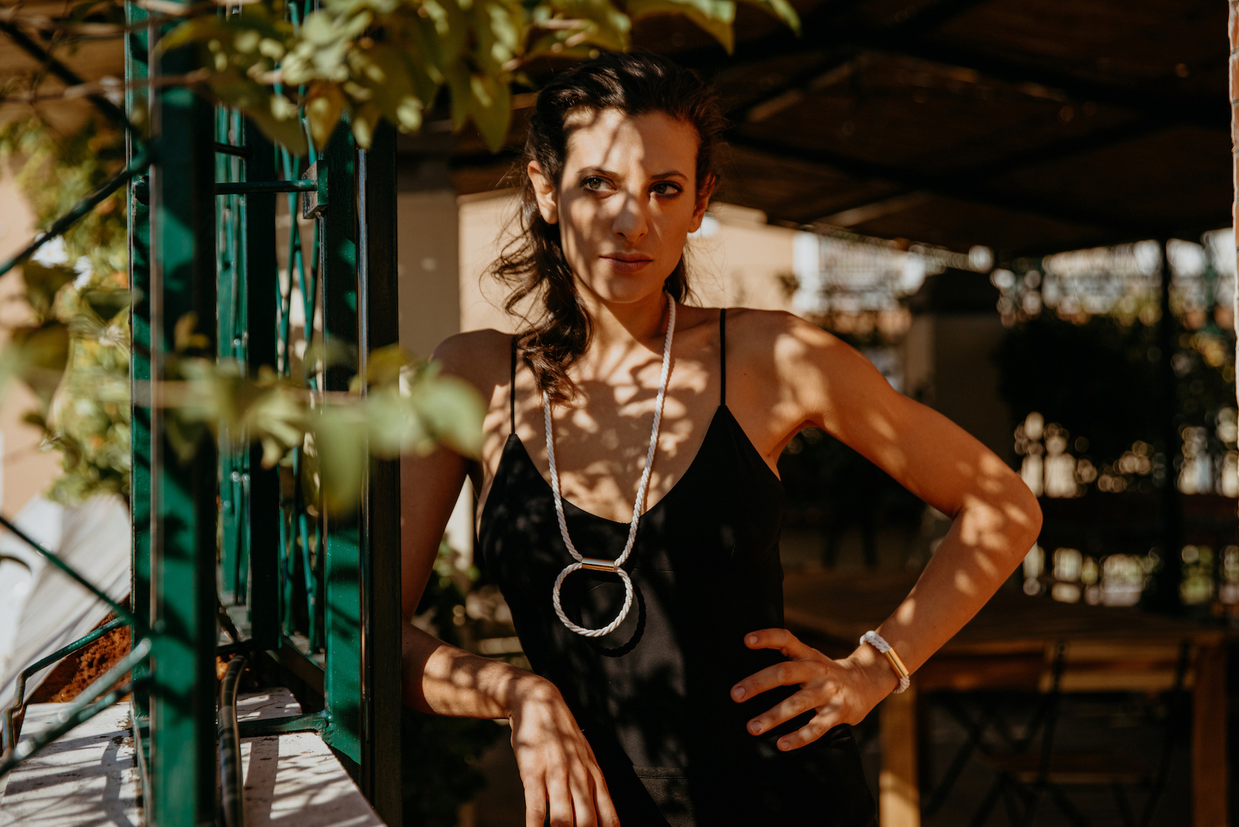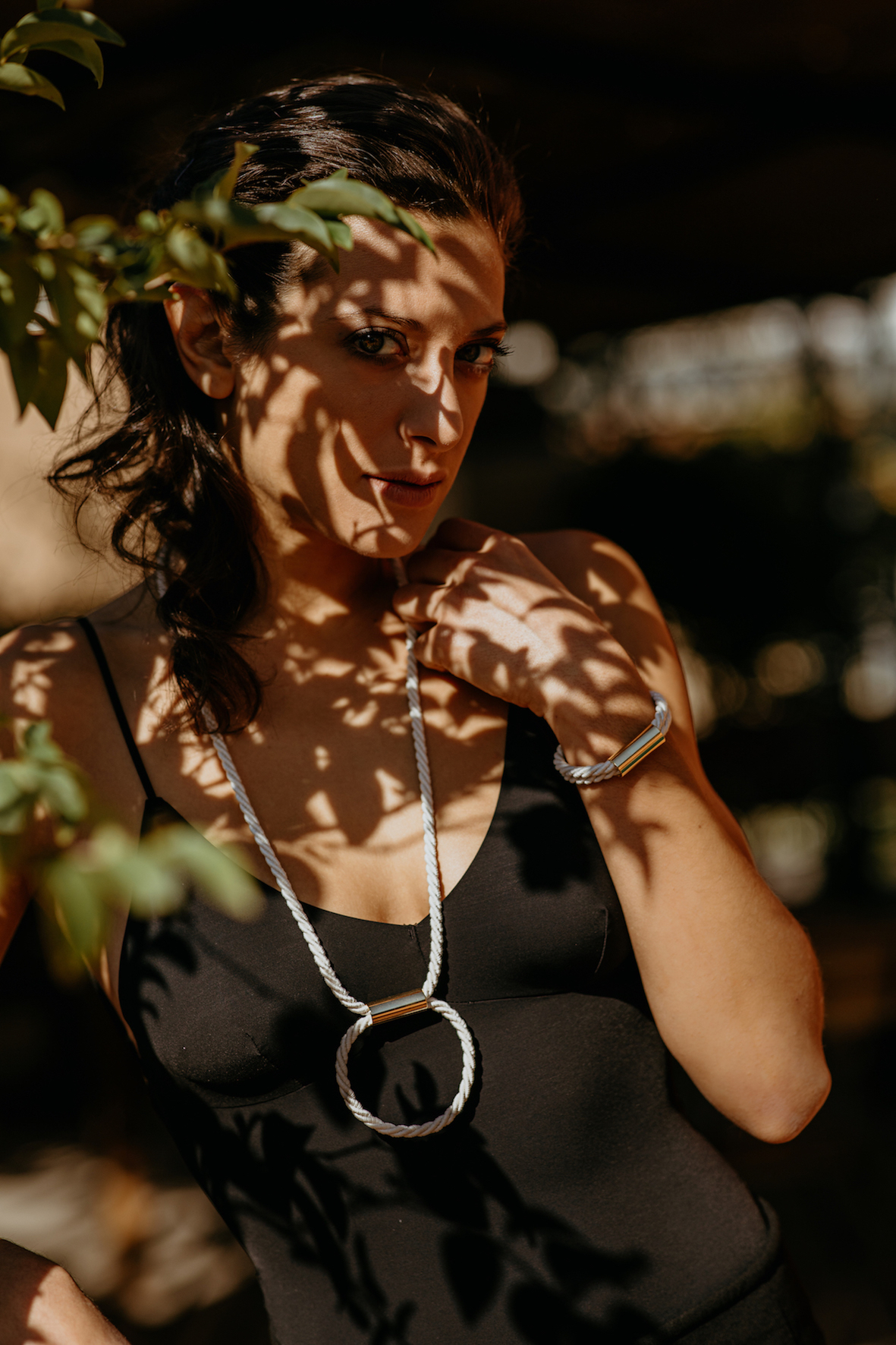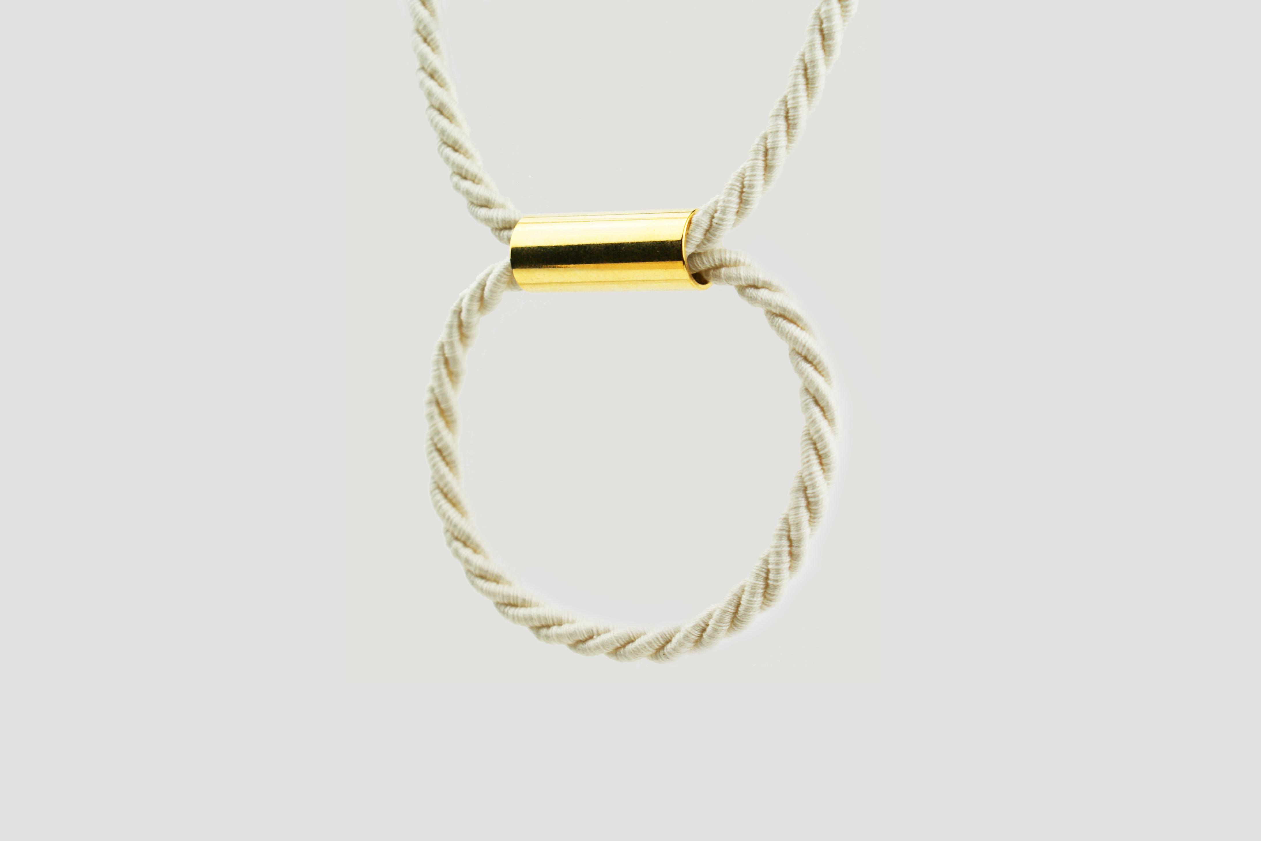 Specifics: Handmade necklace Gold plated brass tube Cotton twisted rope Gold plated magnetic clasp Length: circa 41cm Width: circa 8cm Weight: circa 25gr