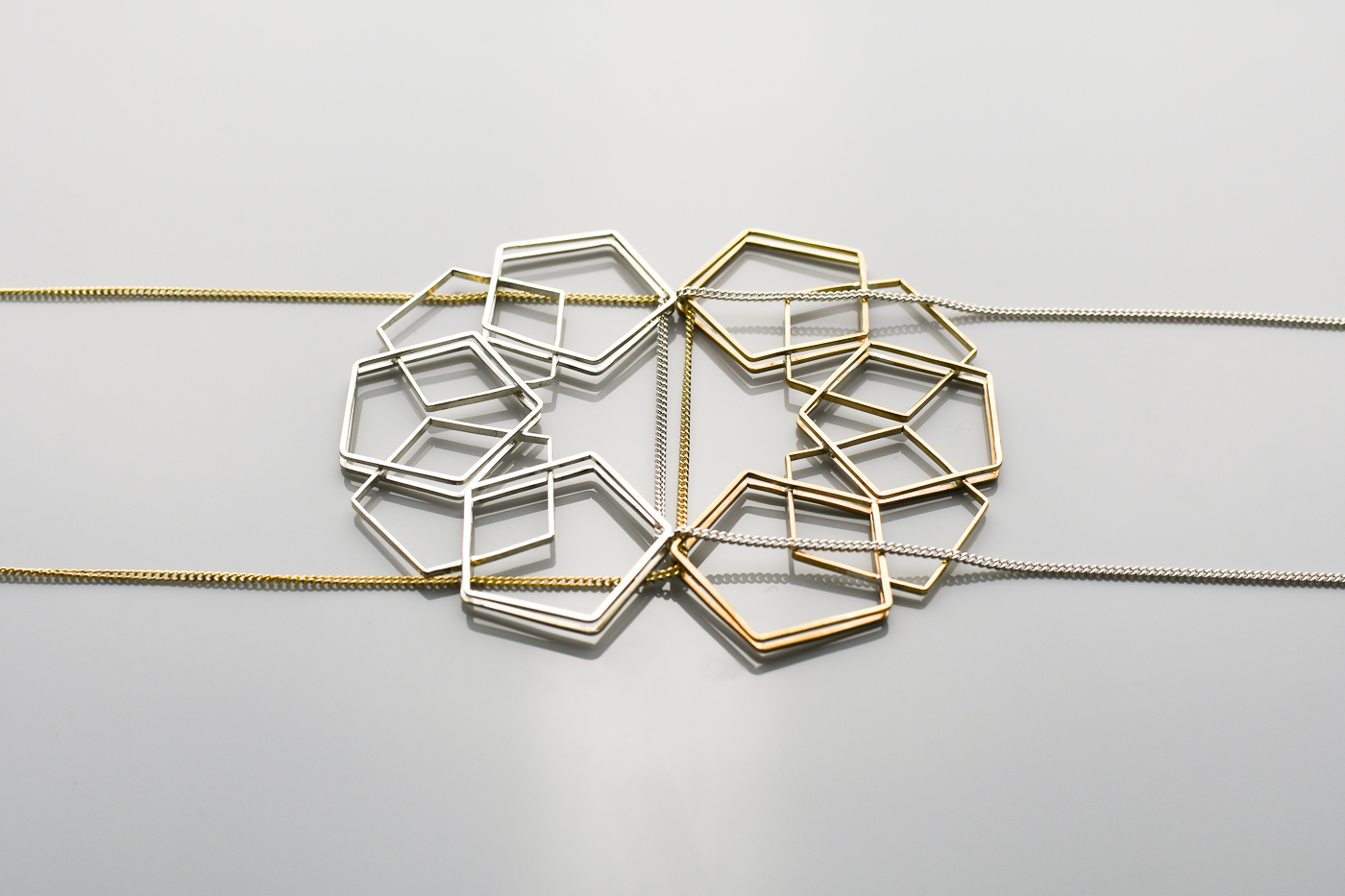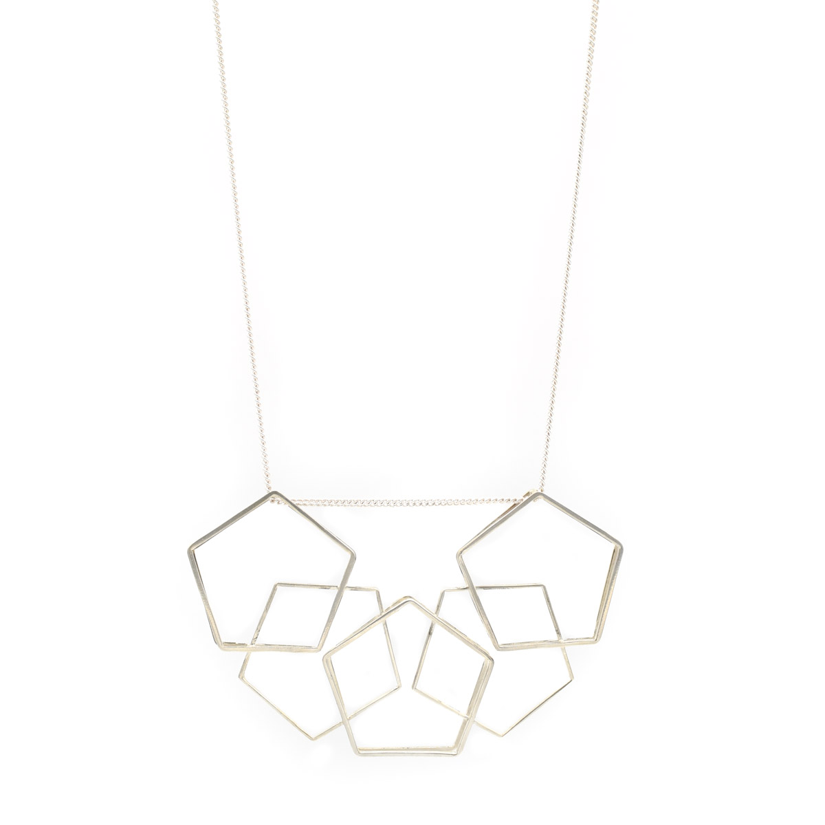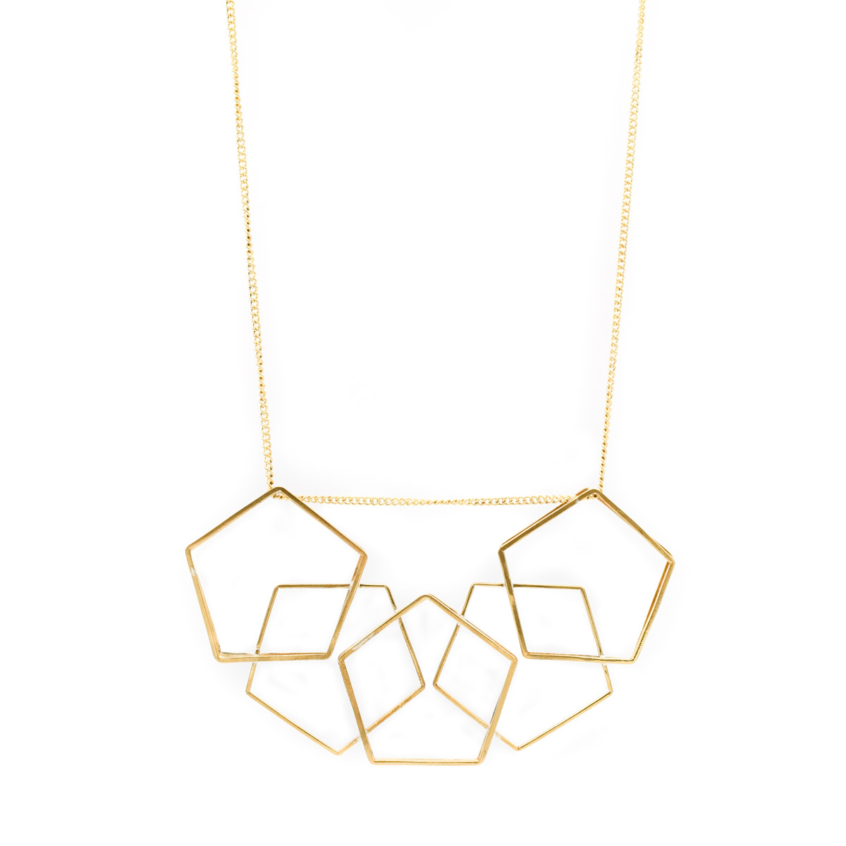 The Pent Girih Necklace features five interlocking pentagons that form a partial rosette motif, threaded on a long chain. The striking, modernist necklace is perfect for a bold yet classy look. The pendant measures 3 ⅜ ” x 2” Hangs on a 28” chain Available in silver or gold plate