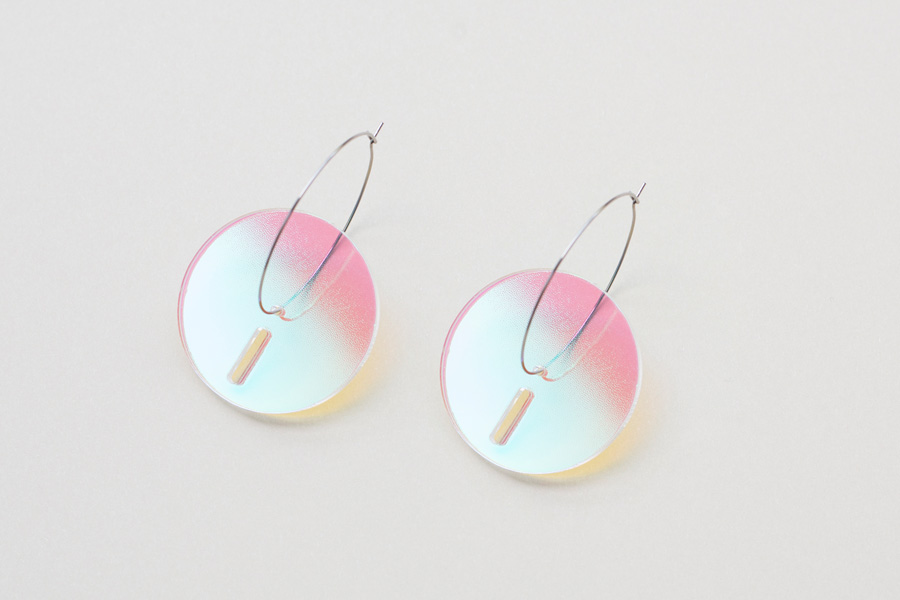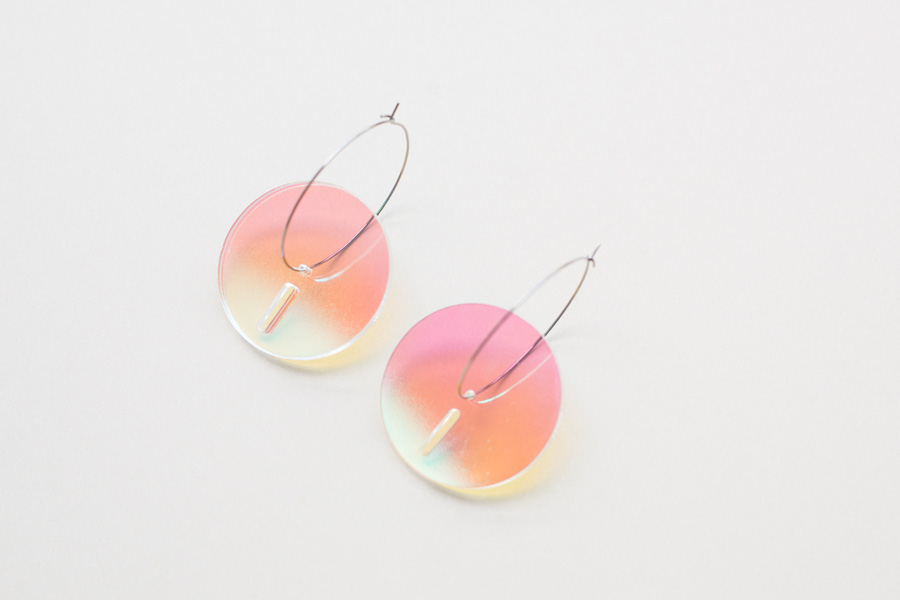Seasonless and ethereal. This playful piece, meant to elevate your everyday outfit with a touch of shine and sophistication. Materials: Made of high quality cast acrylic 3mm and ø40mm Stainless Steel hoop (hypoallergenic) Dimensions: ø40mm Weight: 4.5gr unit Ethically made in Europe