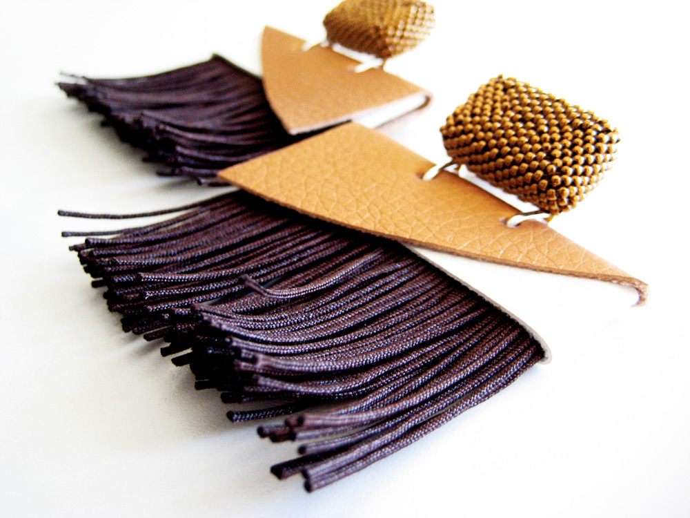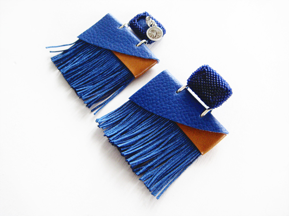 Peacock earrings CODE: EAR_PCK Statement earrings with dark brown fringes Bronze rectangle stud earring Geometric pendant in bronze and white faux leather & fringes. Bold light and easy to wear For going to work or to take a walk in the city For a metropolitan style rock & glam ;) DETAILS I personally design and realize these earrings by hand in Italy. Rectangle stud earring is made by sewing cylindrical glass beads through the techniques Herringbone-Peyote. The faux leather is cut by hand and sewn with the regular points. Fringes are made by hand with a synthetic rope that do not frays. MATERIALS Stud earrings: hypoallergenic steel -nickel free-, hight quality cylindric blue glass beads Pendant: blue/light brown faux-leather, fringe in blue rope DIMENSIONS Length 2.8 in (7 cm) Width 2 in (5,2 cm) ► This product is made to order for you. The product you will receive may not be identical to the one in the picture although done with the same technique and the same materials. I will reproduce every single piece for you. You will receive a unique product; small differences or imperfections are a guarantee of an artisan product, authentic and original. ► This model it′s available in different colourways; choose yours from the up right menu. ► The earrings will come to you in a black network bag, I suggest to store it there to always keep it in good shape. At the end of this page, I give you all the tips on how to take care of. ► If you want the same earring with the pin in sterling silver 925 or, if you want to customize this product (colors, lenght, etc.), you can do by contacting me before placing your order. TO PRESERVE YOUR JEWEL: - do not expose too much to the sunlight - avoid the contact with detergent, cold cream, perfume or colored fabrics that could be discolored on it - clean the beads of stud earrings regularly with a soft and dry rag -clean the faux leather only with neutral detergents - keep in its original package