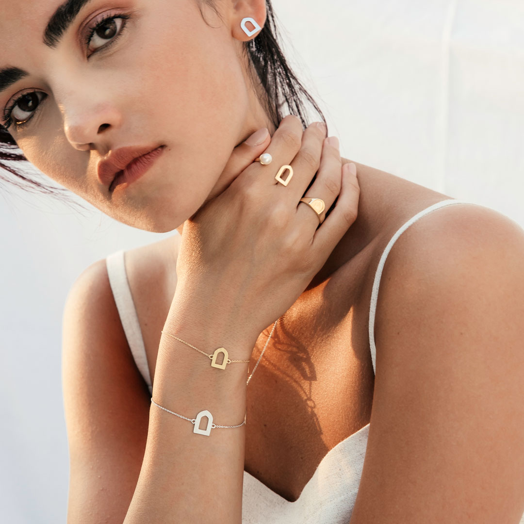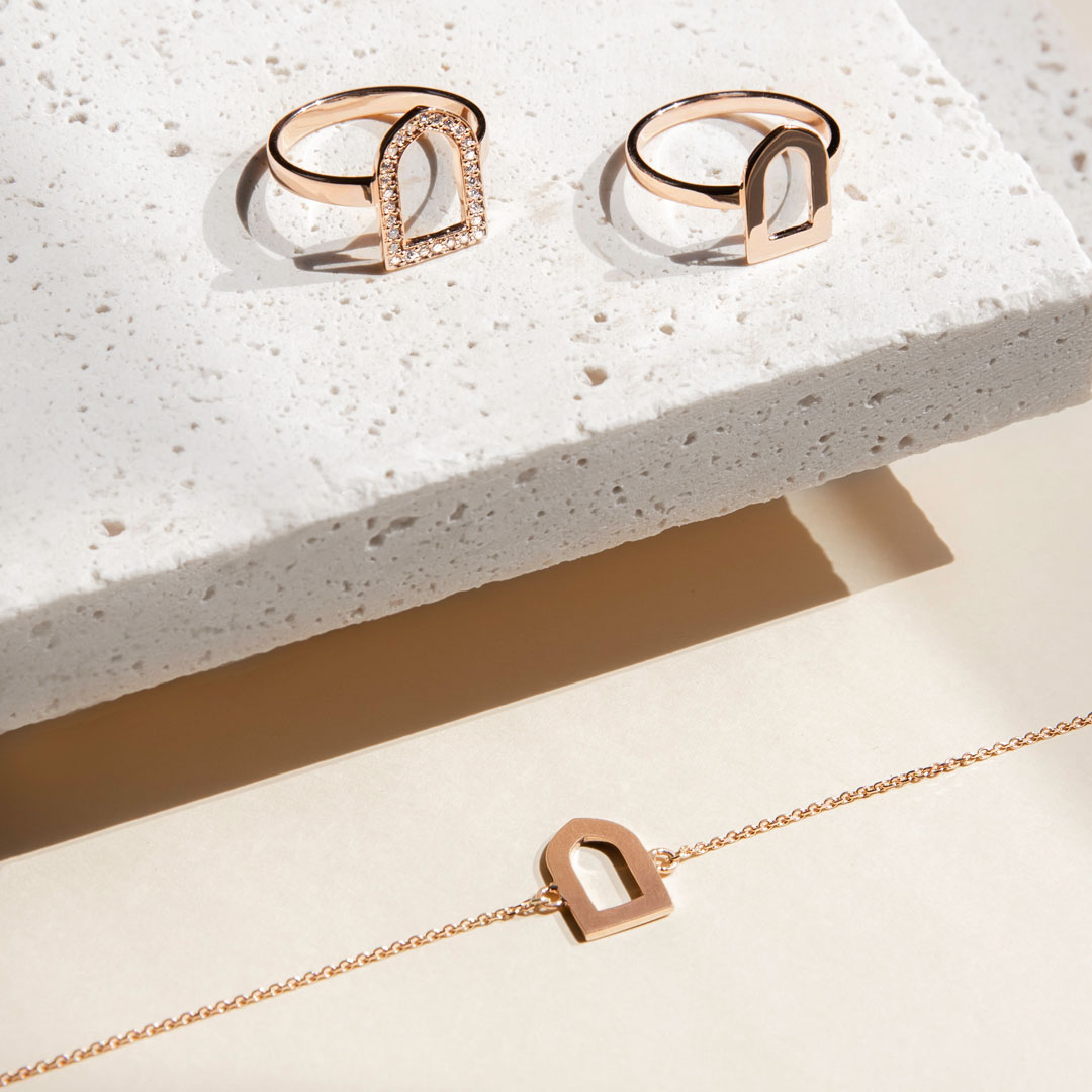 Inspired by Iran′s ancient architecture ″Sahra″ by Sheida Farrokhi couples Persian roots with modern day fashion. Material: 18k Rose Gold, Matte Finish Width: 8.5mm Length: 12mm Thickness: 1mm Weight: 1.74gr Totall Chain Length is 17cm with an extra jump ring at 15cm.