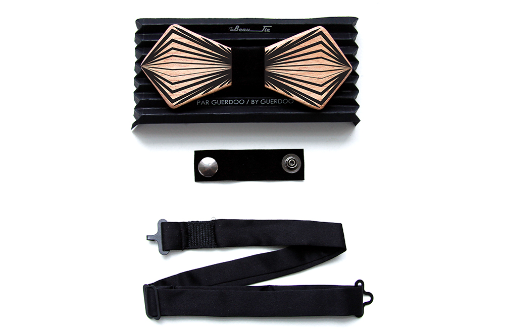 From “The Beau-Tie” Collection, these Reversible Wooden Bow Ties have won the “Best New Product Award” at NYNOW, New York in 2018. The bow ties are made in four different models, designed by Guerdoo and cut by James Klym, a Custom Electric Guitar Artist based in Montreal. All wood pieces are reclaimed from the remaining of his Guitars’ production, carefully cut and hand crafted at his workshop. So, each piece has a different color and grain patternand carries a story from the past, coming from a different guitar, which makes it unique and original. Each bow tie is reversible, with its geometric graphic pattern on one side and plain natural grain pattern on the other, it serves as two accessories embedded in one! This allows the user to have so many mix and match opportunities to create different styles. It is a great gift for everybody to use in any occasion from formal events like weddings, and graduation parties, to cool friend′s parties, proms, bars or a nice and chill family reunion. BEFORE CHOOSING ANY MODEL, IT IS IMPORTANT TO CHOOSE YOUR PREFERRED WOOD FINISHING : - MAPLE (LIGHT TONE) - MAHOGANY (MIDDLE TONE) - WALNUT (DARK TONE) Each piece will be assembled and ready to use at Guerdoo Design Studio. Proudly made in Montreal, Canada, our Bow Ties collection introduces a fresh approach towards how one can use an accessory. Our goal is to create a design that is comfortable, unique and most importantly undefeated by the force of Time! Please contact us for any questions, concerns, large orders, customer service, or feedback.