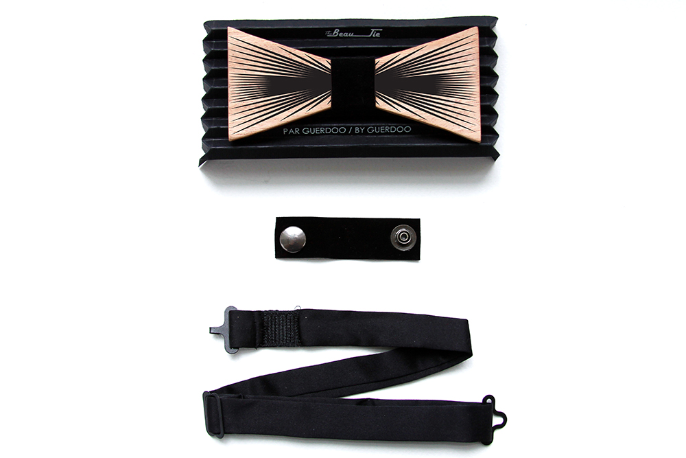 From “The Beau-Tie” Collection, these Reversible Wooden Bow Ties have won the “Best New Product Award” at NYNOW, New York in 2018. The bow ties are made in four different models, designed by Guerdoo and cut by James Klym, a Custom Electric Guitar Artist based in Montreal. All wood pieces are reclaimed from the remaining of his Guitars’ production, carefully cut and hand crafted at his workshop. So, each piece has a different color and grain patternand carries a story from the past, coming from a different guitar, which makes it unique and original. Each bow tie is reversible, with its geometric graphic pattern on one side and plain natural grain pattern on the other, it serves as two accessories embedded in one! This allows the user to have so many mix and match opportunities to create different styles. It is a great gift for everybody to use in any occasion from formal events like weddings, and graduation parties, to cool friend′s parties, proms, bars or a nice and chill family reunion. BEFORE CHOOSING ANY MODEL, IT IS IMPORTANT TO CHOOSE YOUR PREFERRED WOOD FINISHING : - MAPLE (LIGHT TONE) - MAHOGANY (MIDDLE TONE) - WALNUT (DARK TONE) Each piece will be assembled and ready to use at Guerdoo Design Studio. Proudly made in Montreal, Canada, our Bow Ties collection introduces a fresh approach towards how one can use an accessory. Our goal is to create a design that is comfortable, unique and most importantly undefeated by the force of Time! Please contact us for any questions, concerns, large orders, customer service, or feedback.