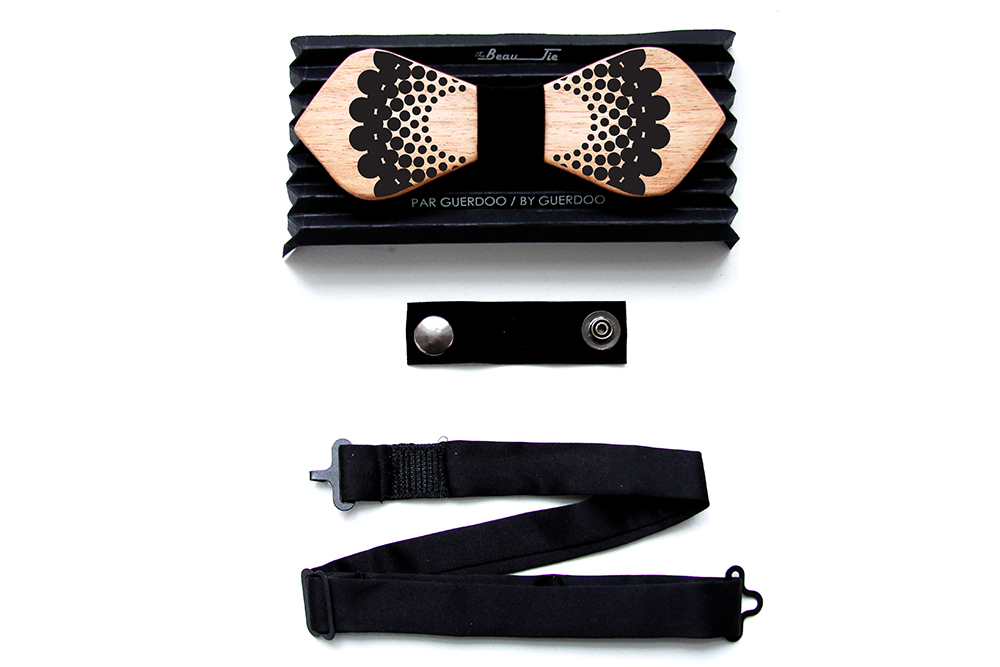 From “The Beau-Tie” Collection, these Reversible Wooden Bow Ties have won the “Best New Product Award” at NYNOW, New York in 2018. The bow ties are made in four different models, designed by Guerdoo and cut by James Klym, a Custom Electric Guitar Artist based in Montreal. All wood pieces are reclaimed from the remaining of his Guitars’ production, carefully cut and hand crafted at his workshop. So, each piece has a different color and grain patternand carries a story from the past, coming from a different guitar, which makes it unique and original. Each bow tie is reversible, with its geometric graphic pattern on one side and plain natural grain pattern on the other, it serves as two accessories embedded in one! This allows the user to have so many mix and match opportunities to create different styles. It is a great gift for everybody to use in any occasion from formal events like weddings, and graduation parties, to cool friend′s parties, proms, bars or a nice and chill family reunion. BEFORE CHOOSING ANY MODEL, IT IS IMPORTANT TO CHOOSE YOUR PREFERRED WOOD FINISHING : - MAPLE (LIGHT TONE) - MAHOGANY (MIDDLE TONE) - WALNUT (DARK TONE) Each piece will be assembled and ready to use at Guerdoo Design Studio. Proudly made in Montreal, Canada, our Bow Ties collection introduces a fresh approach towards how one can use an accessory. Our goal is to create a design that is comfortable, unique and most importantly undefeated by the force of Time! Please contact us for any questions, concerns, large orders, customer service, or feedback.
