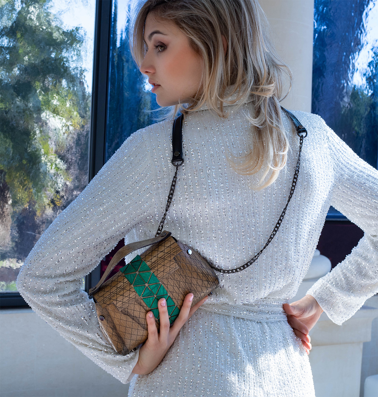 In this mini bag in wood we have created a unique contempary and absolutely trendy design. Grace Collection - Made from Ash wood 1960s design becomes a contemporary again!! A wooden mini-bag in many color varieties. The wood used is Ash, colored in different trendy colors, current and in line with the spring-summer 2019 trends. Only in wood and eco leather inside. Each bag is forged by hand, carved to make each product unique and unrepeatable. The feeling that one has when wearing a Fuscra creation is to wear a small jewelry box of Nature. The noble and ancient wood material is transformed and enhanced with ecological glues and solvents to ensure a unique tactile and olfactory experience. Product features: Hidden magnet closure, black eco leather interior, metal strap with Italian high quality black leather; The front bar is an absolute novelty: the Ash wood is treated as if it were ′wooden fabric′ resting on the silhouette of the bag and sewn by hand. Product dimensions: 22x14 cm x 7 cm